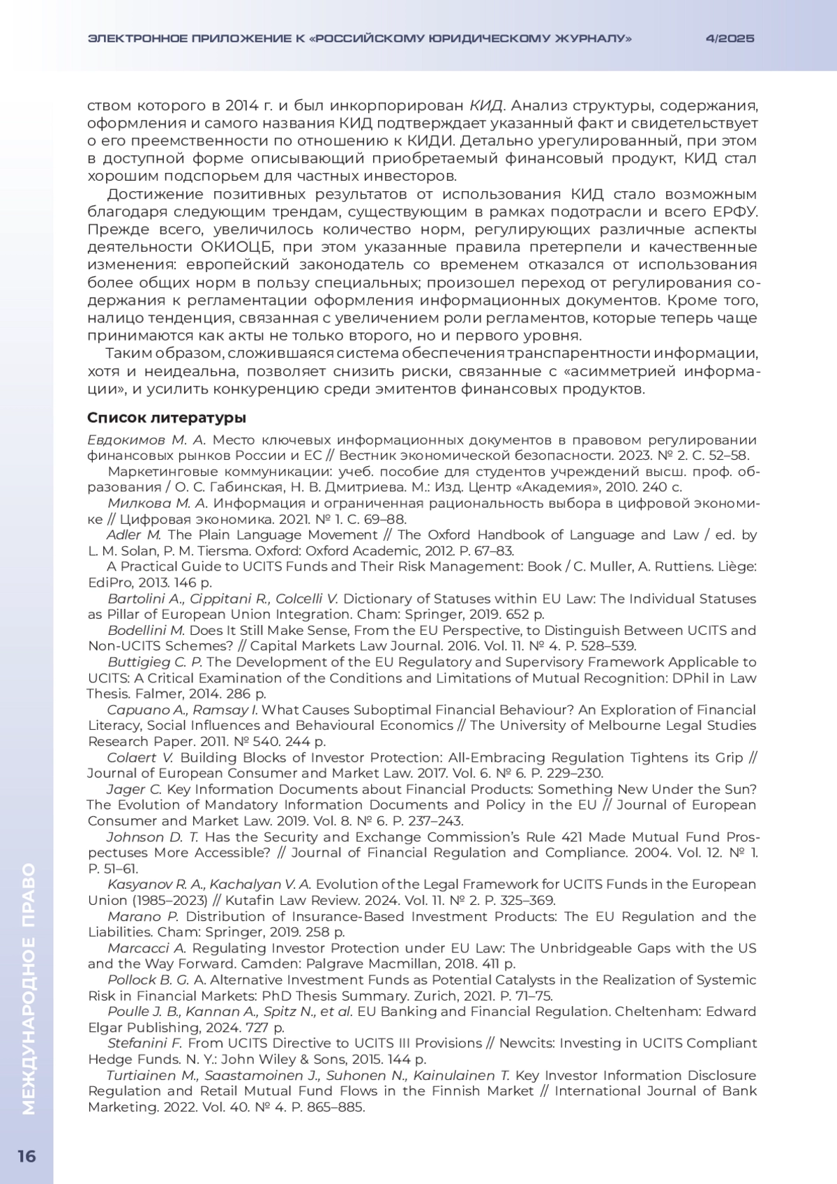 1. Евдокимов М. А. Место ключевых информационных документов в правовом регулировании финансовых рынков России и ЕС // Вестник экономической безопасности. 2023. № 2. С. 52-58.