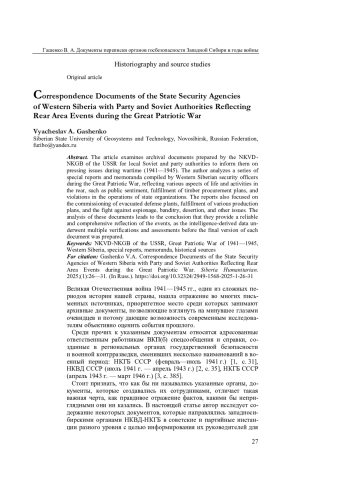 В статье рассматриваются архивные документы, подготовленные органами НКВД-НКГБ СССР для местных советских и партийных органов в целях информирования их по актуальным вопросам военного времени (1941—1945). Автор анализирует содержание ряда спецсообщений и справок, созданных западносибирскими чекистами в годы Великой Отечественной войны, отражающих различные стороны жизни и деятельности в тылу (настроения населения, выполнение плана лесозаготовок, нарушения в деятельности государственных организаций), также в сообщениях уделялось внимание введению в строй эвакуированных оборонных предприятий, выполнению различных планов, борьбе со шпионажем, бандитизмом, дезертирством и т. д. Анализ документов позволяет сделать вывод о достоверном и полном отражении в них происходящих событий, так как полученные оперативным путем данные многократно проверялись и анализировались перед подготовкой окончательного варианта документа.