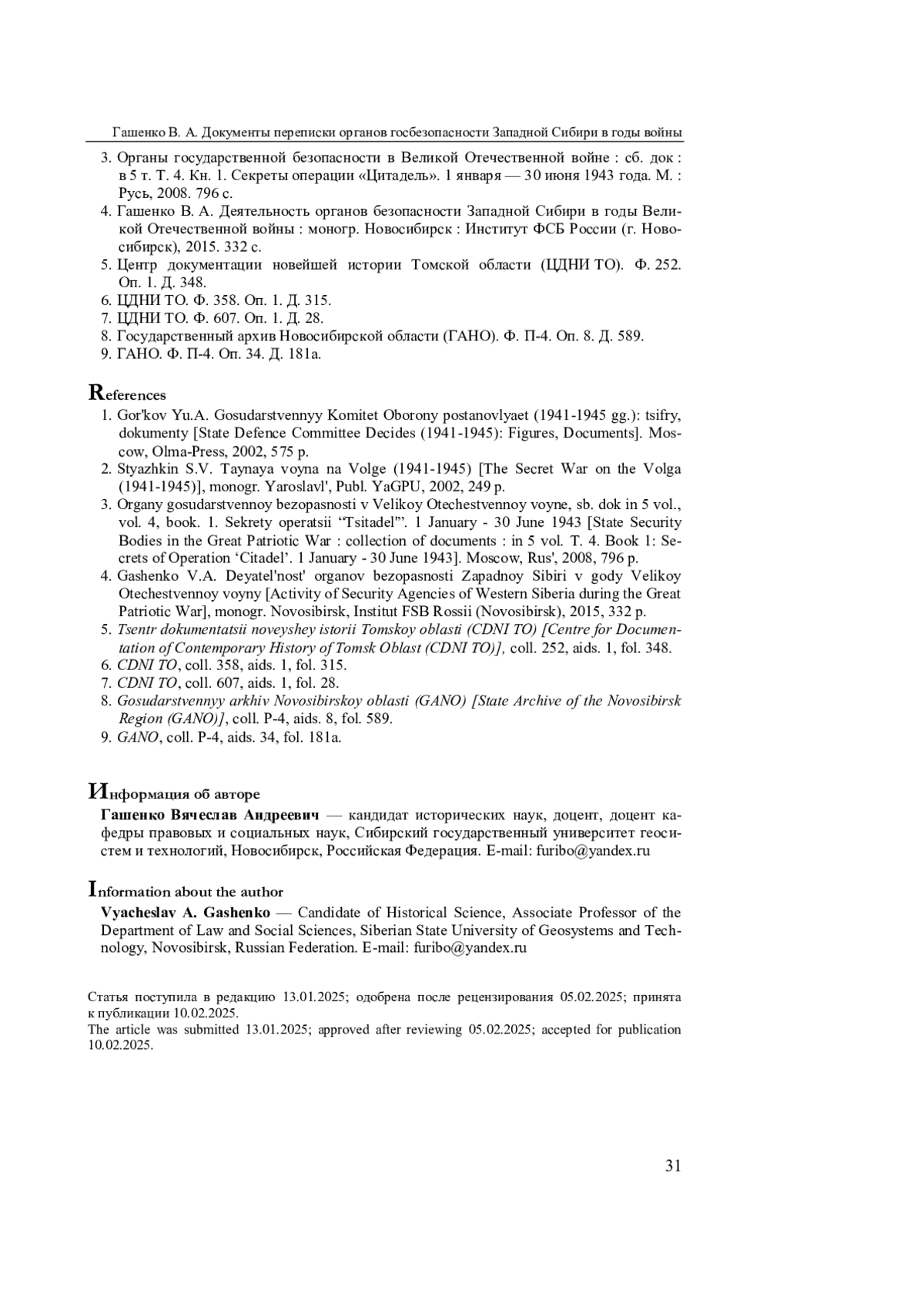 4. Гашенко В. А. Деятельность органов безопасности Западной Сибири в годы Великой Отечественной войны: моногр. Новосибирск: Институт ФСБ России (г. Новосибирск), 2015. 332 с.