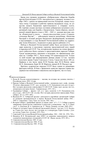 2. Народы Сибири в Великой Отечественной войне: материалы науч. конф., посвящ. 50-летию образования СССР / ред. коллегия: А. П. Окладников (отв. ред.) [и др.]; Ин-т истории, филологии и философии СО АН СССР. Тувин. науч.-исслед. ин-т яз., литературы и истории. Кызыл: Тувкнигоиздат, 1973. 321 с.