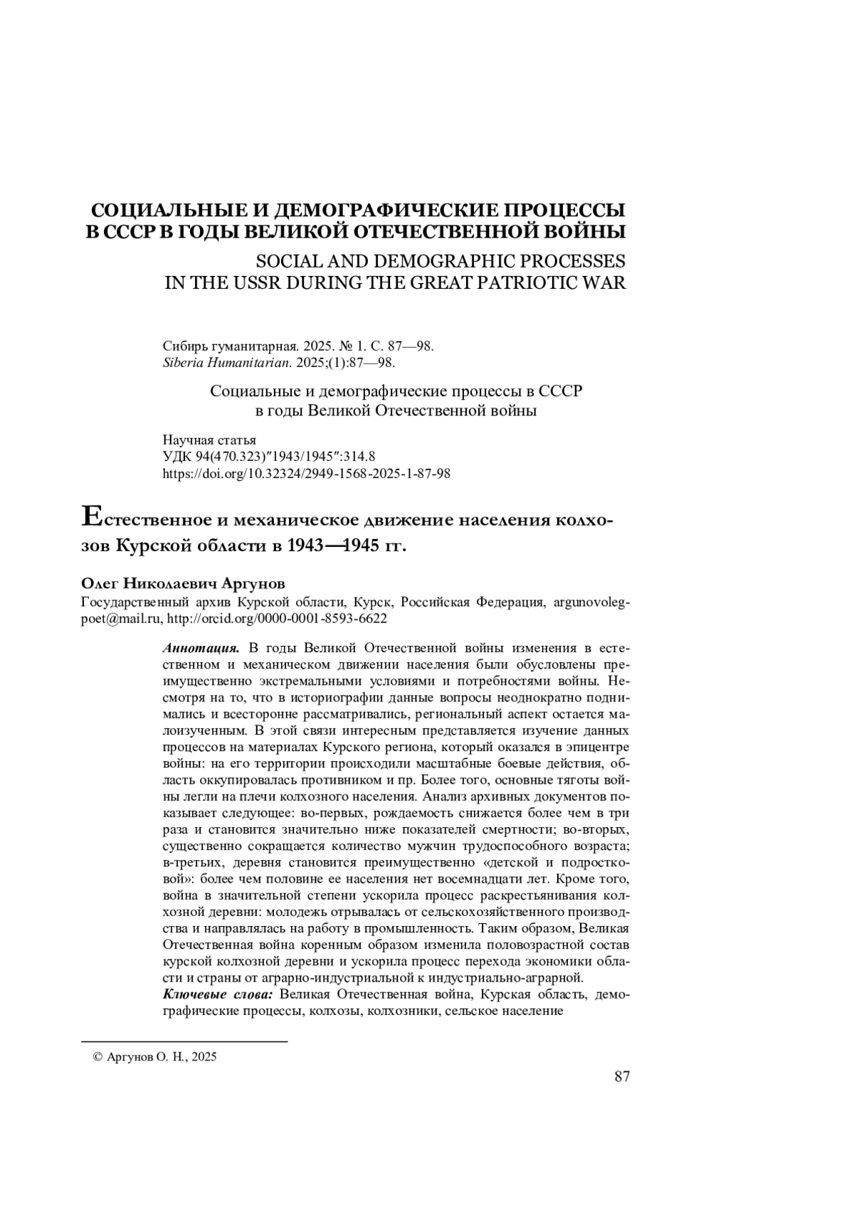 В годы Великой Отечественной войны изменения в естественном и механическом движении населения были обусловлены преимущественно экстремальными условиями и потребностями войны. Несмотря на то, что в историографии данные вопросы неоднократно поднимались и всесторонне рассматривались, региональный аспект остается малоизученным. В этой связи интересным представляется изучение данных процессов на материалах Курского региона, который оказался в эпицентре войны: на его территории происходили масштабные боевые действия, область оккупировалась противником и пр. Более того, основные тяготы войны легли на плечи колхозного населения. Анализ архивных документов показывает следующее: во-первых, рождаемость снижается более чем в три раза и становится значительно ниже показателей смертности; во-вторых, существенно сокращается количество мужчин трудоспособного возраста; в-третьих, деревня становится преимущественно «детской и подростковой»: более чем половине ее населения нет восемнадцати лет. Кроме того, война в значительной степени ускорила процесс раскрестьянивания колхозной деревни: молодежь отрывалась от сельскохозяйственного производства и направлялась на работу в промышленность. Таким образом, Великая Отечественная война коренным образом изменила половозрастной состав курской колхозной деревни и ускорила процесс перехода экономики области и страны от аграрно-индустриальной к индустриально-аграрной.