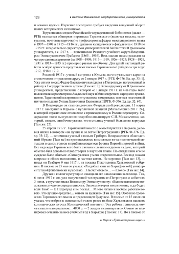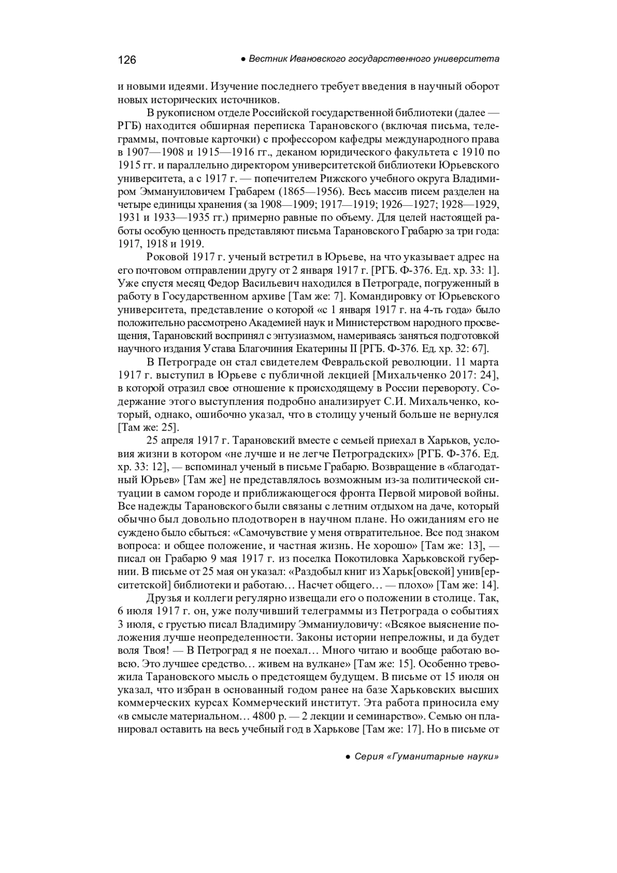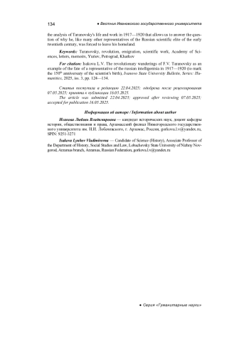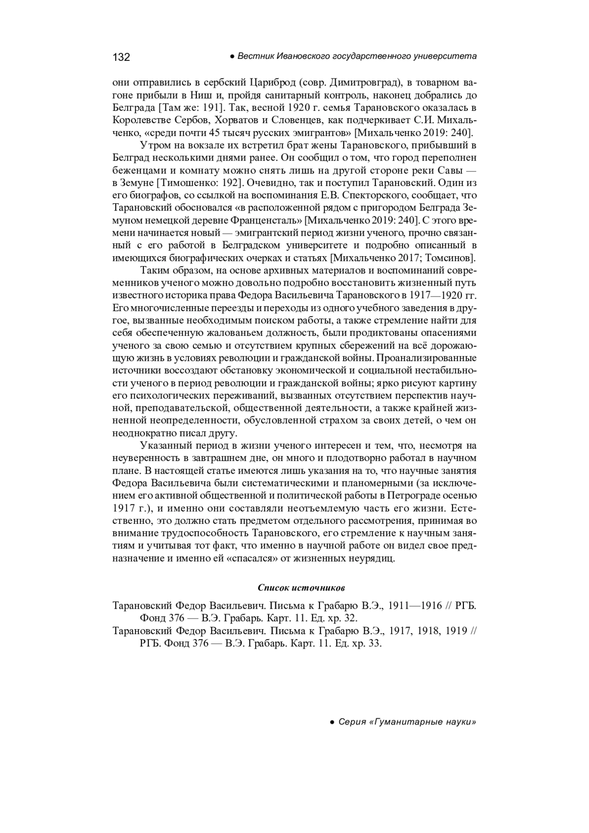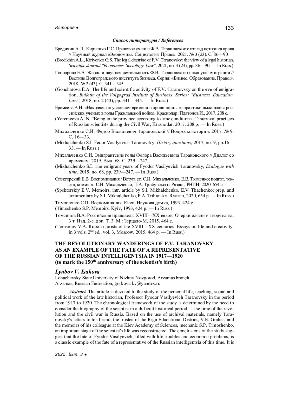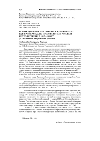 ИСАКОВА Л. В. РЕВОЛЮЦИОННЫЕ СКИТАНИЯ Ф. В. ТАРАНОВСКОГО КАК ПРИМЕР СУДЬБЫ ПРЕДСТАВИТЕЛЯ РУССКОЙ ИНТЕЛЛИГЕНЦИИ В 1917-1920 ГГ. (К 150-ЛЕТИЮ СО ДНЯ РОЖДЕНИЯ УЧЕНОГО) // ВЕСТНИК ИВАНОВСКОГО ГОСУДАРСТВЕННОГО УНИВЕРСИТЕТА. СЕРИЯ: ГУМАНИТАРНЫЕ НАУКИ. 2025. № 3