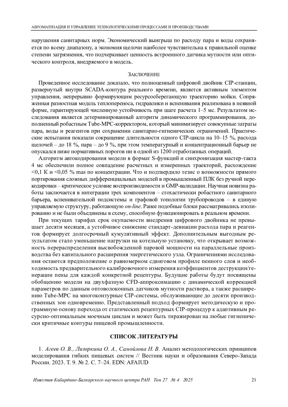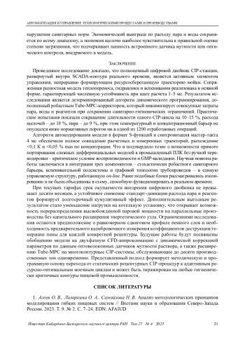 Выводы. Внедрение оптимизированных профилей позволило сократить длительность полного цикла CIP на 10-15 %, а потребление щелочи и пара снизить в среднем на 20 % при сохранении микробиологической чистоты оборудования. Полученные результаты подтверждают не только техническую реализуемость предлагаемого подхода, но и его экономическую целесообразность.