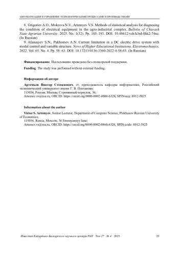 8. Григорьев А. О., Мокрова Н. В., Артемьев В. С. Методы статистического анализа для диагностики состояния электрооборудования в агропромышленном комплексе // Вестник Чувашского государственного аграрного университета. 2025. № 1(32). С. 185-193. DOI: 10.48612/vch/k3rd-8hk2-74nz EDN: NDHHHY
