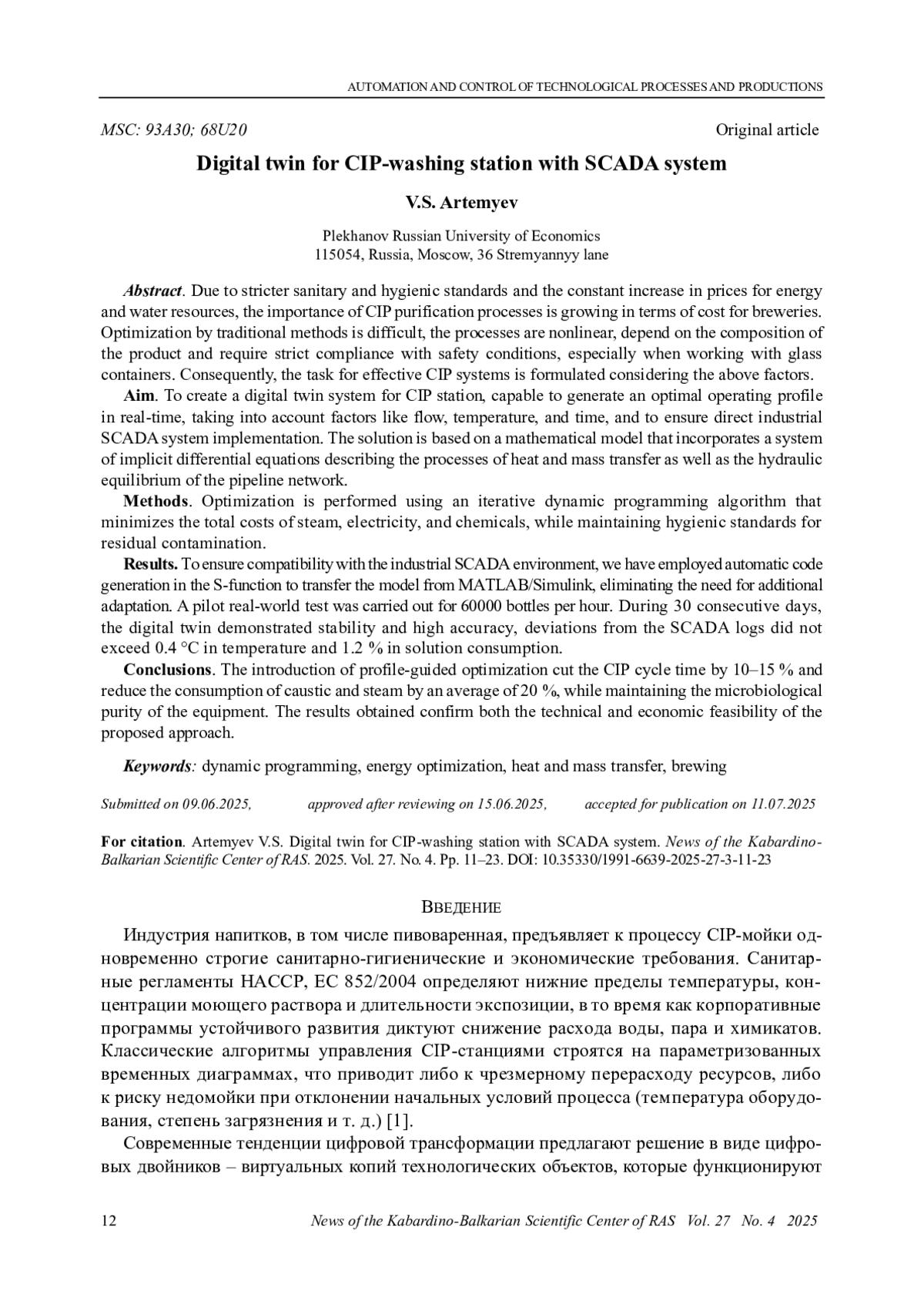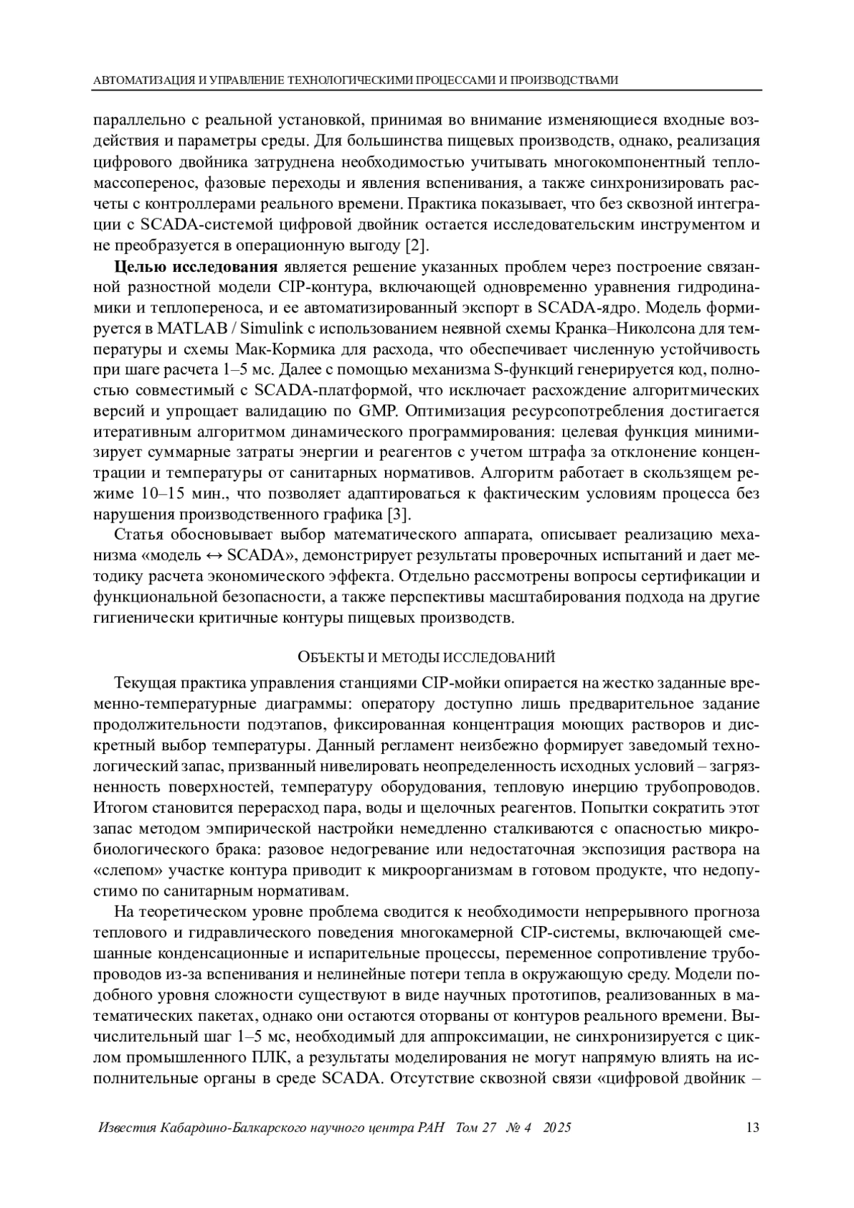 Цель исследования - создание цифрового двойника станции CIP, способного в реальном времени формировать оптимальный по ресурсопотреблению профиль режимов - с учетом расхода, температуры и времени - и обеспечивать его прямое исполнение в среде промышленной SCADA. В основе решения лежит математическая модель, включающая сопряженную систему неявных разностных уравнений, описывающих процессы тепло- и массообмена, а также гидравлический баланс трубопроводной сети.