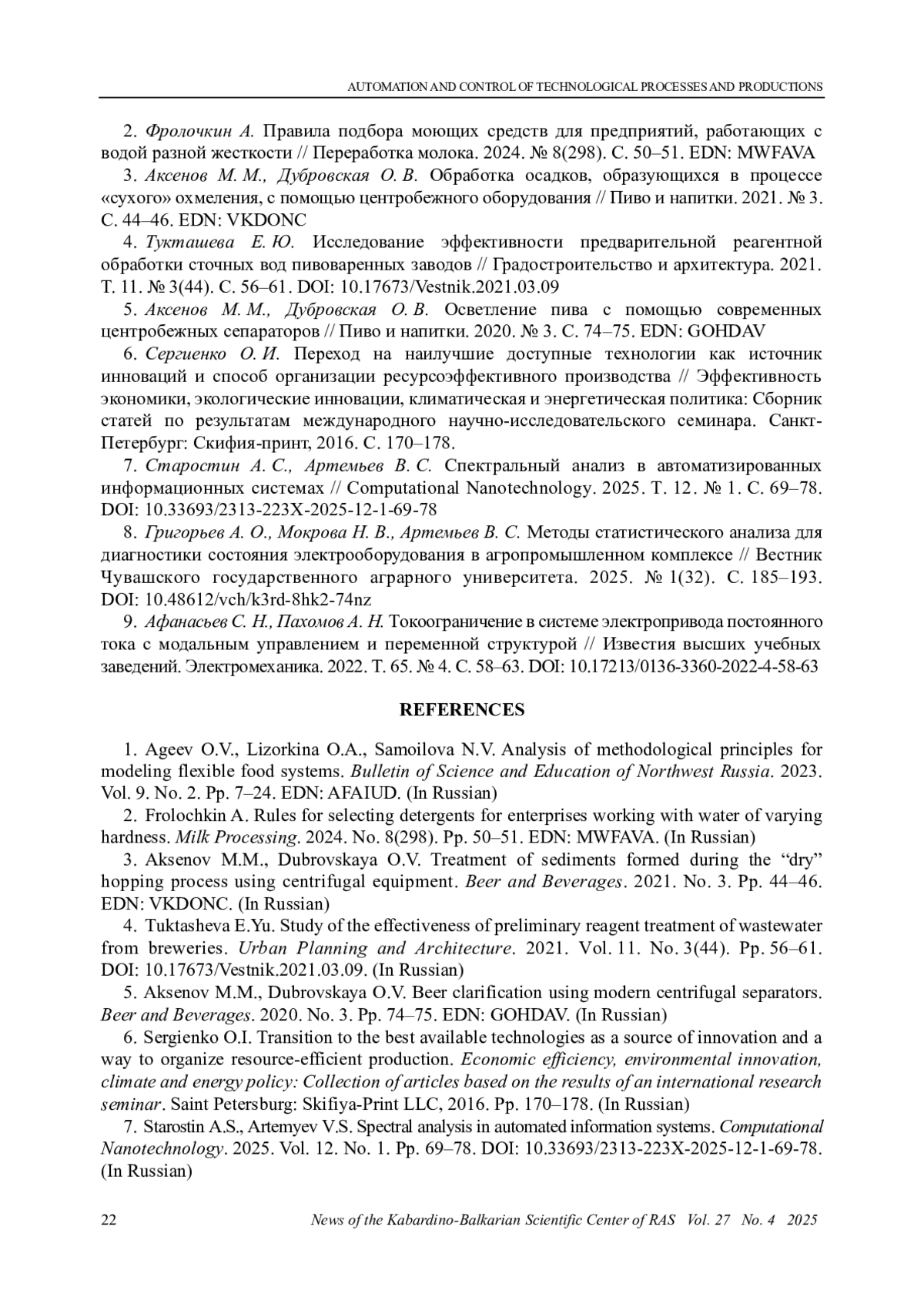 3. Аксенов М. М., Дубровская О. В. Обработка осадков, образующихся в процессе “сухого” охмеления, с помощью центробежного оборудования // Пиво и напитки. 2021. № 3. С. 44-46. EDN: VKDONC
