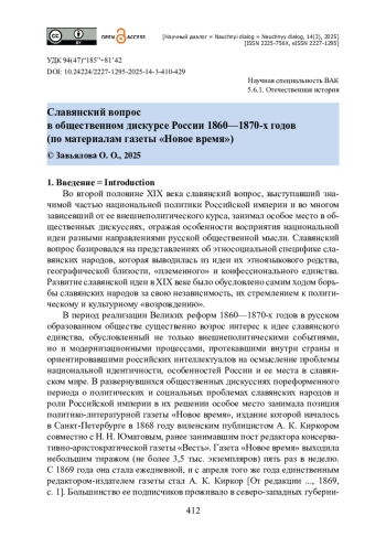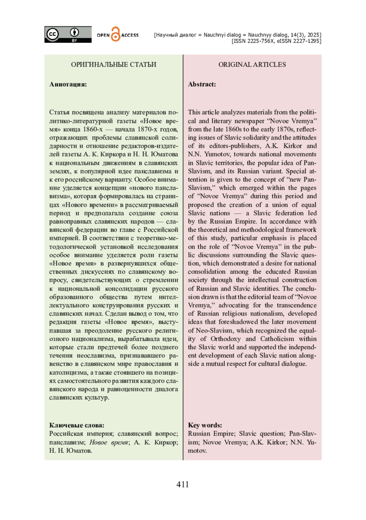 Статья посвящена анализу материалов политико-литературной газеты «Новое время» конца 1860-х — начала 1870-х годов, отражающих проблемы славянской солидарности и отношение редакторов-издателей газеты А. К. Киркора и Н. Н. Юматова к национальным движениям в славянских землях, к популярной идее панславизма и к его российскому варианту. Особое внимание уделяется концепции «нового панславизма», которая формировалась на страницах «Нового времени» в рассматриваемый период и предполагала создание союза равноправных славянских народов — славянской федерации во главе с Российской империей. В соответствии с теоретико-методологической установкой исследования особое внимание уделяется роли газеты «Новое время» в развернувшихся общественных дискуссиях по славянскому вопросу, свидетельствующих о стремлении к национальной консолидации русского образованного общества путем интеллектуального конструирования русских и славянских начал. Сделан вывод о том, что редакция газеты «Новое время», выступавшая за преодоление русского религиозного национализма, вырабатывала идеи, которые стали предтечей более позднего течения неославизма, признававшего равенство в славянском мире православия и католицизма, а также стоявшего на позициях самостоятельного развития каждого славянского народа и равноценности диалога славянских культур.