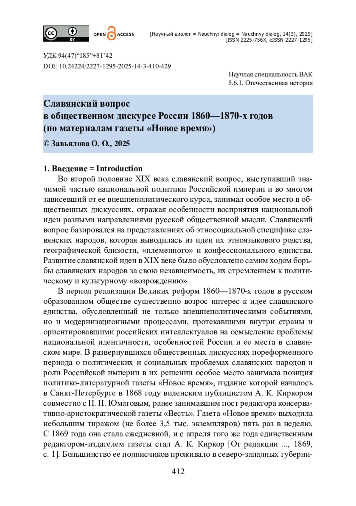 6. Завьялова О. О. В борьбе с «бестактным либерализмом» : А. К. Киркор и газета «Новое время» о последствиях Великих реформ. В конце 1860-х - начале 1870-х гг. / О. О. Завьялова // Historia provinciae - журнал региональной истории. - 2023. - Т. 7. - С. 762-809. - https://doi.org/10.23859/2587-8344-2023-7-3-1.