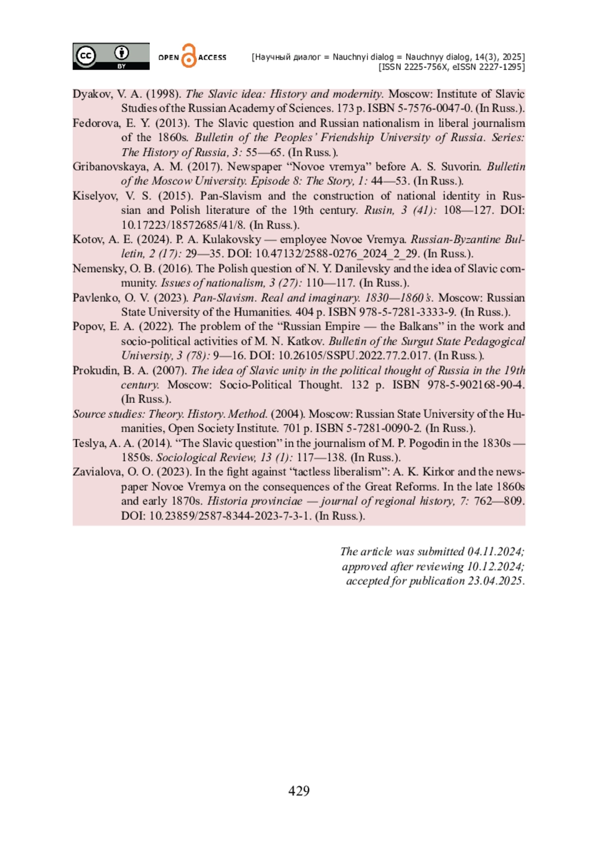 9. Котов А. Э. П. А. Кулаковский - сотрудник «Нового времени» / А. Э. Котов // Русско-Византийский вестник. - 2024. - № 2 (17). - С. 29-35. - https://doi.org/10.47132/2588-0276_2024_2_29.