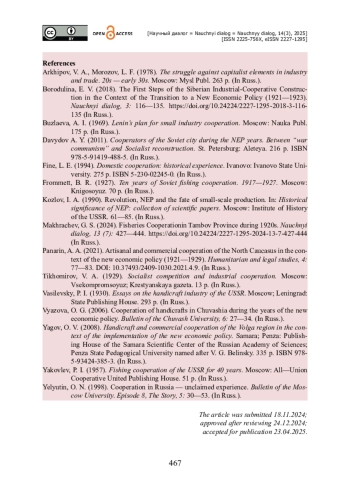 2. Бородулина Е. В. Первые шаги сибирского промкооперативного строительства в условиях перехода к новой экономической политике (1921-1923 годы) / Е. В. Бородулина // Научный диалог. - 2018. - № 3. - С. 116-135. - https://doi.org/10.24224/2227-1295-2018-3-116-135.