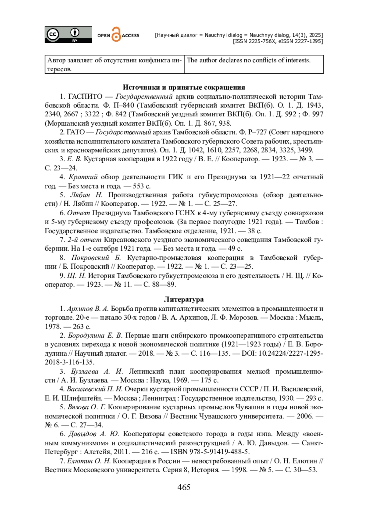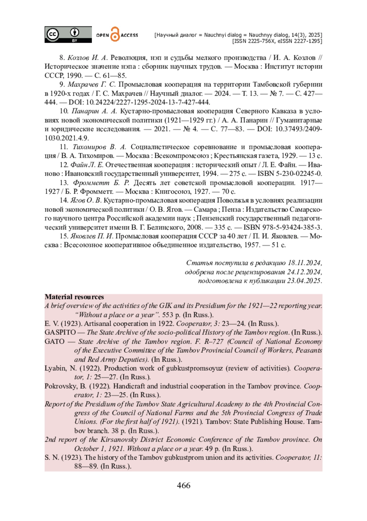 9. Махрачев Г. С. Промысловая кооперация на территории Тамбовской губернии в 1920-х годах / Г. С. Махрачев // Научный диалог. - 2024. - Т. 13. - № 7. - С. 427-444. - https://doi.org/10.24224/2227-1295-2024-13-7-427-444.