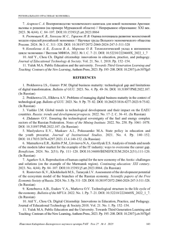 7. Агарков С. А. Воспроизводство человеческого капитала для новой экономики Арктики: вызовы и решения (на примере Мурманской области) // Непрерывное образование: XXI век. 2023. № 4(44). С. 84-107. DOI: 10.15393/j5.art.2023.8864 EDN: KRPAWS