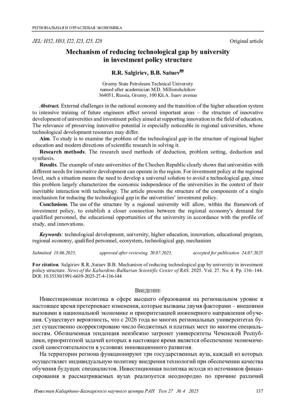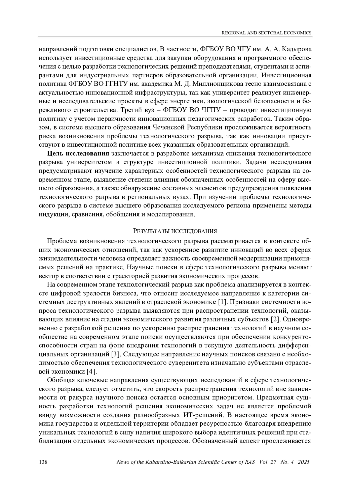 Результаты. На примере государственных вузов Чеченской Республики наглядно показано, что на территории региона могут функционировать университеты с разными потребностями в инновационном развитии. Для инвестиционной политики на уровне региона подобная ситуация означает необходимость разработки универсального решения во избежание технологического разрыва, так как именно указанная проблема во многом характеризует экономическую самостоятельность вуза в условиях неизбежного взаимодействия с технологиями. В статье приведена структура компонентов единого механизма снижения технологического разрыва университета в структуре инвестиционной политики.