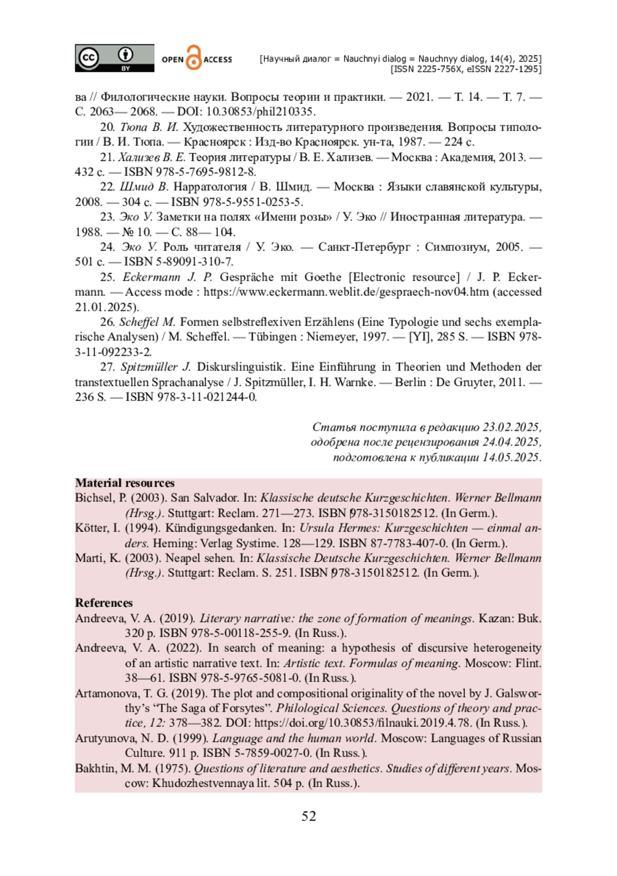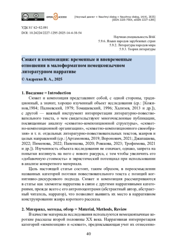 АНДРЕЕВА В. А. СЮЖЕТ И КОМПОЗИЦИЯ: ВРЕМЕННЫЕ И ВНЕВРЕМЕННЫЕ ОТНОШЕНИЯ В МАЛОФОРМАТНОМ НЕМЕЦКОЯЗЫЧНОМ ЛИТЕРАТУРНОМ НАРРАТИВЕ // НАУЧНЫЙ ДИАЛОГ. 2025. ТОМ 14, № 4