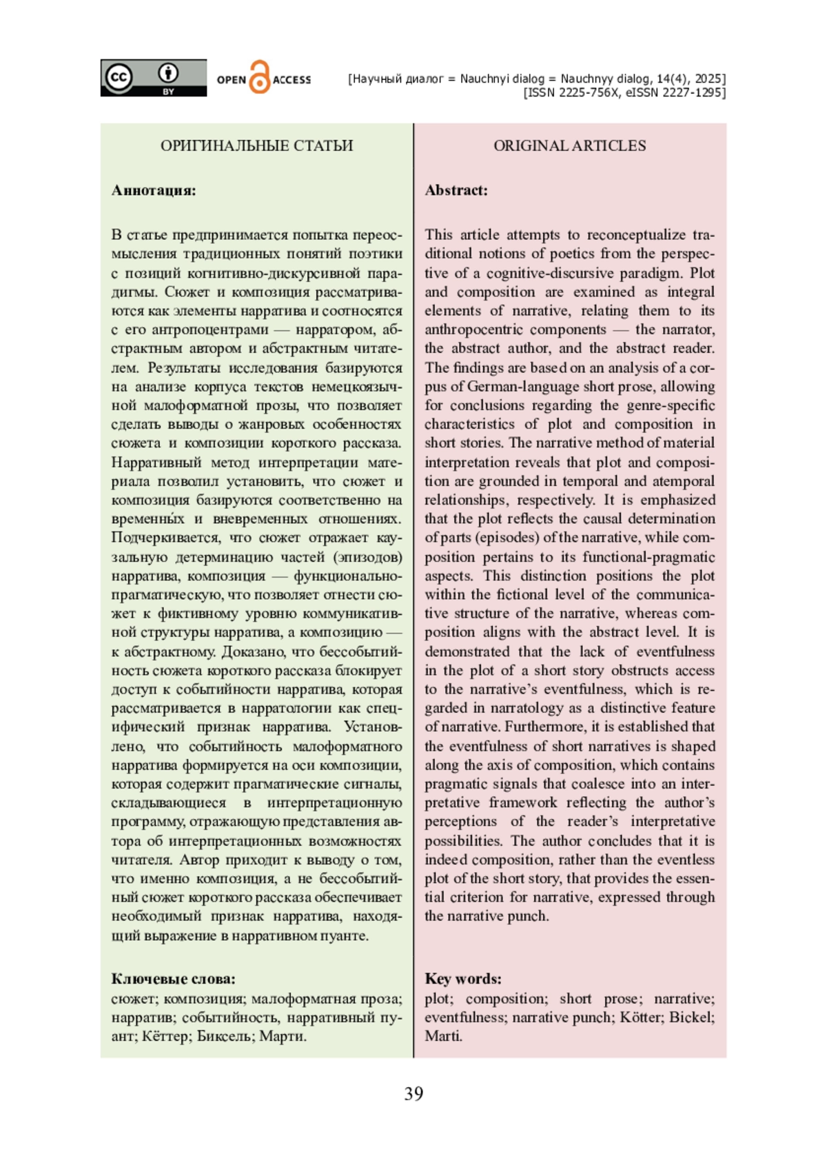 В статье предпринимается попытка переосмысления традиционных понятий поэтики с позиций когнитивно-дискурсивной парадигмы. Сюжет и композиция рассматриваются как элементы нарратива и соотносятся с его антропоцентрами — нарратором, абстрактным автором и абстрактным читателем. Результаты исследования базируются на анализе корпуса текстов немецкоязычной малоформатной прозы, что позволяет сделать выводы о жанровых особенностях сюжета и композиции короткого рассказа. Нарративный метод интерпретации материала позволил установить, что сюжет и композиция базируются соответственно на временны́х и вневременных отношениях. Подчеркивается, что сюжет отражает каузальную детерминацию частей (эпизодов) нарратива, композиция — функционально-прагматическую, что позволяет отнести сюжет к фиктивному уровню коммуникативной структуры нарратива, а композицию — к абстрактному. Доказано, что бессобытийность сюжета короткого рассказа блокирует доступ к событийности нарратива, которая рассматривается в нарратологии как специфический признак нарратива. Установлено, что событийность малоформатного нарратива формируется на оси композиции, которая содержит прагматические сигналы, складывающиеся в интерпретационную программу, отражающую представления автора об интерпретационных возможностях читателя. Автор приходит к выводу о том, что именно композиция, а не бессобытийный сюжет короткого рассказа обеспечивает необходимый признак нарратива, находящий выражение в нарративном пуанте.