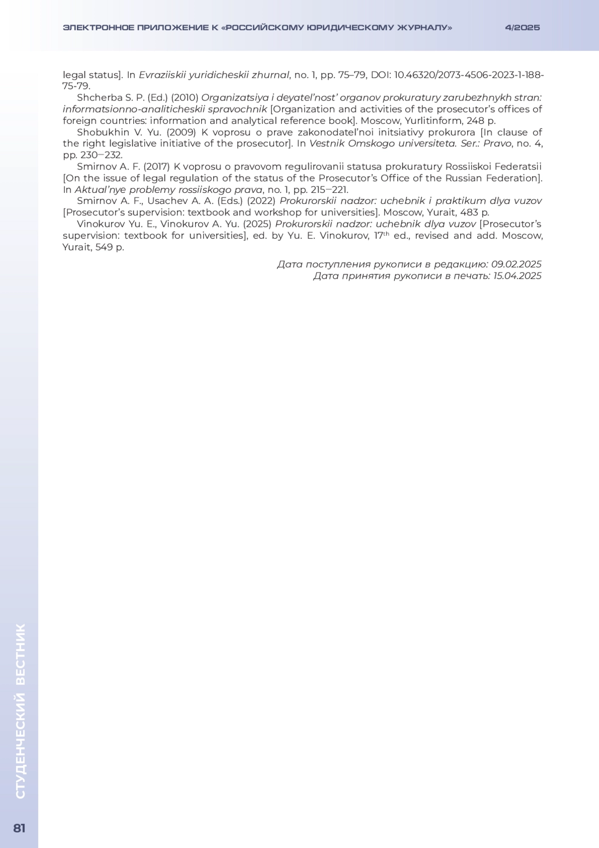 3. Винокуров Ю. Е., Винокуров А. Ю. Прокурорский надзор: учеб. для вузов / под ред. Ю. Е. Винокурова. 17-е изд., перераб. и доп. М.: Юрайт, 2025. 549 с.