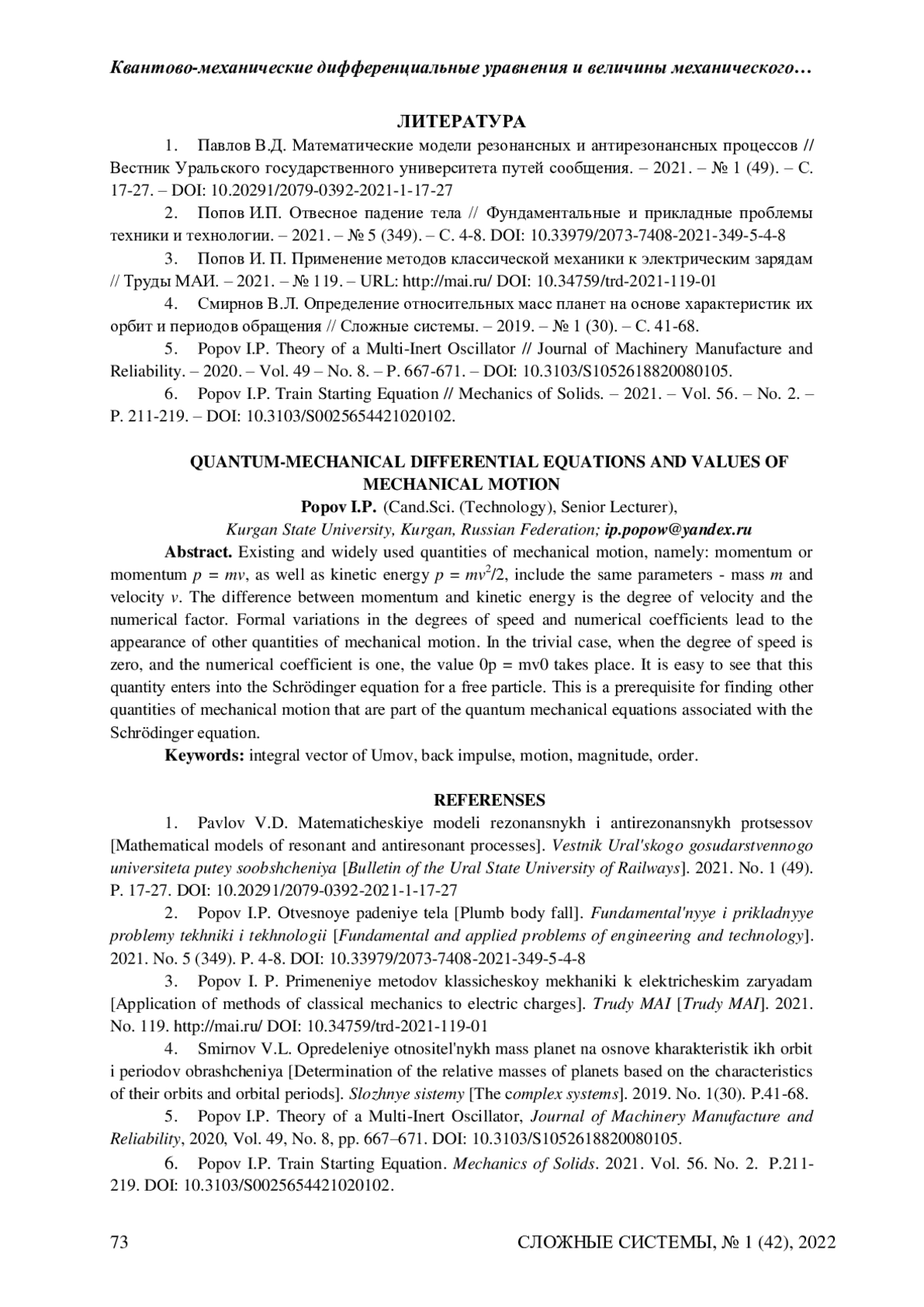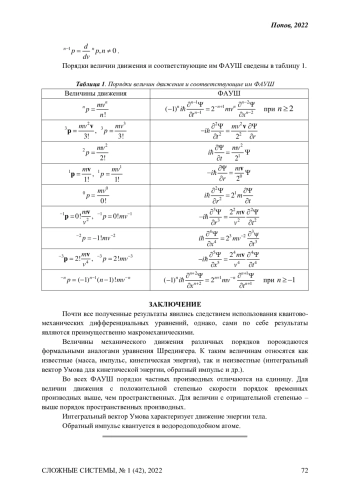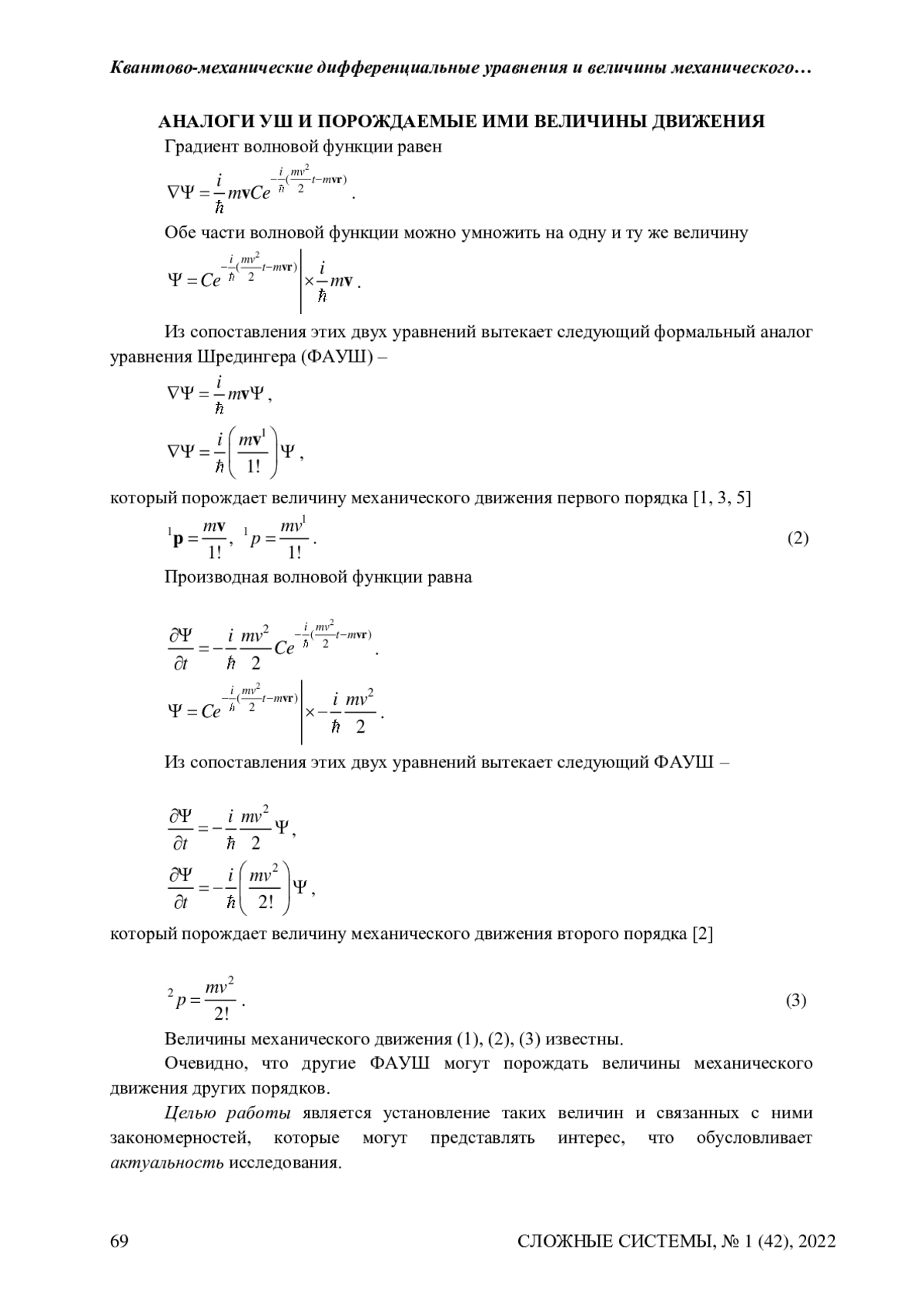 Существующие и широко используемые величины механического движения, а именно: импульс или количество движения p = mv, а также кинетическая энергия p = mv 2/2 включают в себя одни и те же параметры - массу m и скорость v. Отличие между импульсом и кинетической энергией состоит в степени скорости и числовом коэффициенте. Формальные вариации степеней скорости и числовых коэффициентов приводят к появлению других величин механического движения. В тривиальном случае, когда степень скорости равна нулю, а числовой коэффициент - единице, имеет место величина 0 p = mv 0. Нетрудно заметить, что эта величина входит в уравнение Шредингера для свободной частицы. Это является предпосылкой для поиска других величин механического движения, входящих в состав квантово-механических уравнений, связанных с уравнением Шредингера.