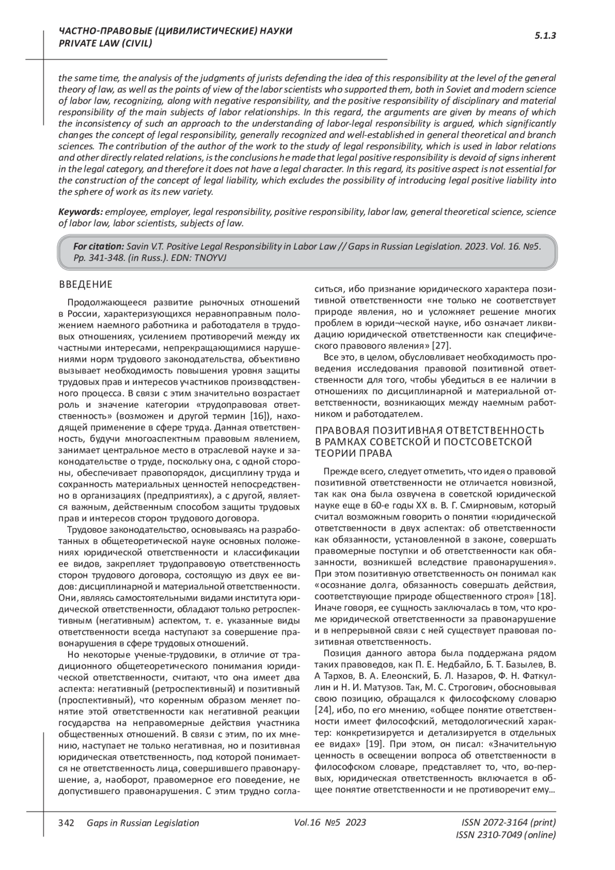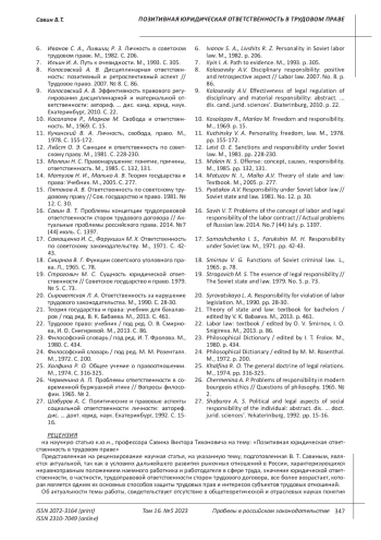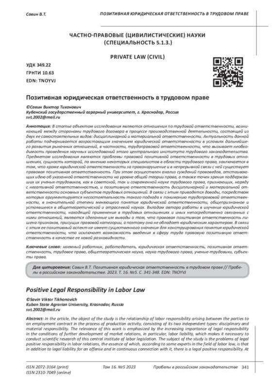 САВИН В. Т. ПОЗИТИВНАЯ ЮРИДИЧЕСКАЯ ОТВЕТСТВЕННОСТЬ В ТРУДОВОМ ПРАВЕ // ПРОБЕЛЫ В РОССИЙСКОМ ЗАКОНОДАТЕЛЬСТВЕ. 2023. Т. 16 № 5