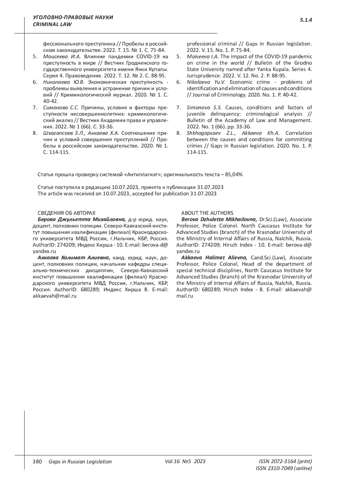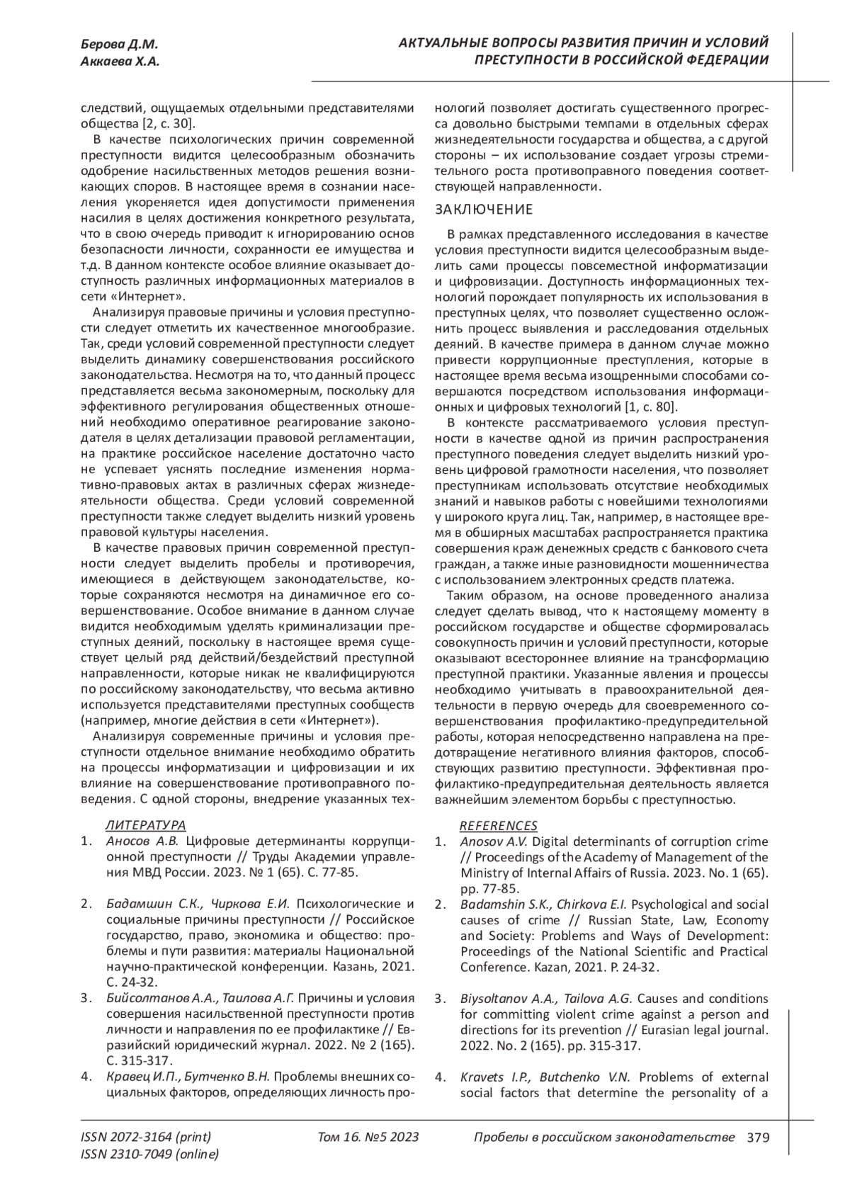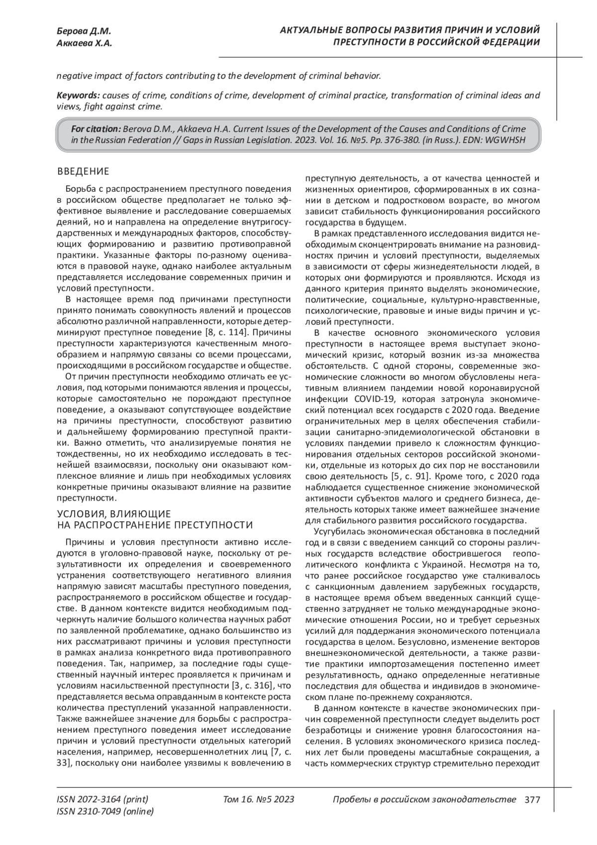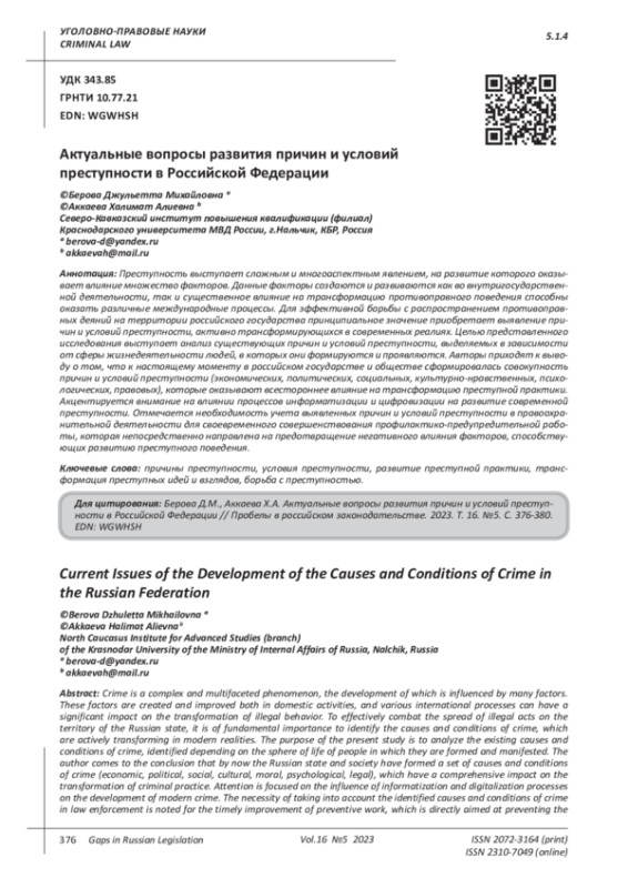 АККАЕВА Х. А., БЕРОВА Д. М. АКТУАЛЬНЫЕ ВОПРОСЫ РАЗВИТИЯ ПРИЧИН И УСЛОВИЙ ПРЕСТУПНОСТИ В РОССИЙСКОЙ ФЕДЕРАЦИИ // ПРОБЕЛЫ В РОССИЙСКОМ ЗАКОНОДАТЕЛЬСТВЕ. 2023. Т. 16 № 5