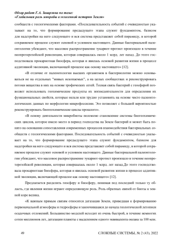Конец 20-го начала 21-го века отмечены успехами бактериальной палеонтологии. Было введено представление об эволюции геосферно-биосферной системы. Это понятие пришло на смену термина Биосфера по В. И. Вернадскому. Одновременно эти достижения дают возможность по-новому взглянуть на природу самых ранних экзогенных процессов в геологии. В геологии традиционно считается, что экзогенные процессы - это результат воздействия внешних подсистем через параметры: солнечный нагрев, климатические воздействия мороза, ветра, дождя, растворения и вымывания подземными и текучими водами на систему земной коры. С введением понятия геосферно-биогенная система акцент должен быть смещен или дополнен понятием экзогенное воздействие микробиоты. Оснований для этого достаточно. Согласно Г. А. Заварзину, вся первичная микробиота образует почти замкнутые циклы, свидетельствующие о переработке основных пород микробиотой в промежуточные продукты с дальнейшим переводом их в осадочные породы. Так древнейшие строматолиты - это первичные осадочные породы - результат жизнедеятельности первичной микробиоты. Они занимали ранее все окраины палеоморей и океанов. Они близки по химическому составу отложениям окраин современных морей и океанов с плантациями из сине-зеленых водорослей. В геосферно-биосферной системе наряду с определяющими прямыми связями от геосферы к биоте большую роль играют трансформирующие обратные связи. Так прокариотное сообщество, катализирующее систему биогеохимических циклов, служит основой для дальнейшей эволюции. Возрастающая сложность живых организмов не упраздняет ключевую роль “невидимой микробиоты” для существования биосферы, а накладывается на созданную ими систему. Следовательно, эволюция носит выраженный аддитивный характер.