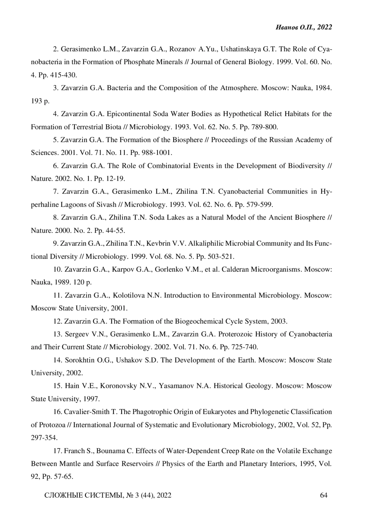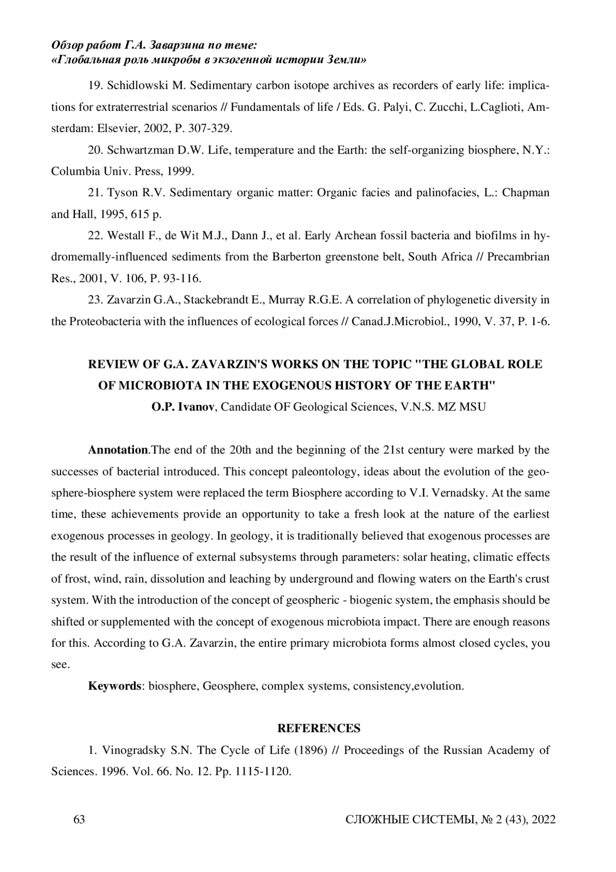 The end of the 20th and the beginning of the 21st century are marked by the successes of bacterial paleontology. The concept of the evolution of the geosphere-biosphere system was introduced. This concept replaced the term Biosphere according to V. I. Vernadsky. At the same time, these achievements provide an opportunity to take a fresh look at the nature of the earliest exogenous processes in geology. In geology, it is traditionally believed that exogenous processes are the result of the influence of external subsystems through parameters: solar heating, climatic effects of frost, wind, rain, dissolution and leaching by groundwater and flowing waters on the Earth’s crust system. With the introduction of the concept of geospheric-biogenic system, the emphasis should be shifted or supplemented with the concept of exogenous microbiota impact. There are enough reasons for this. According to G. A. Zavarzin, the entire primary microbiota forms almost closed cycles, indicating the processing of basic rocks by the microbiota into intermediate products with their further transfer to sedimentary rocks. Thus, the oldest stromatolites are primary sedimentary rocks - the result of the vital activity of the primary microbiota. They previously occupied all the outskirts of the paleomores and oceans. They are similar in chemical composition to the sediments of the margins of modern seas and oceans with plantations of blue-green algae. In the geosphere-biosphere system, along with the defining direct links from the geosphere to biota, transformative feedbacks play an important role. Thus, the prokaryotic community, which catalyzes the system of biogeochemical cycles, serves as the basis for further evolution. The increasing complexity of living organisms does not eliminate the key role of the “invisible microbiota” for the existence of the biosphere, but is superimposed on the system they have created. Consequently, evolution has a pronounced additive character.