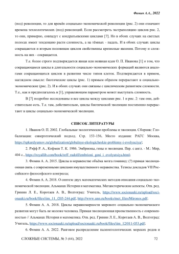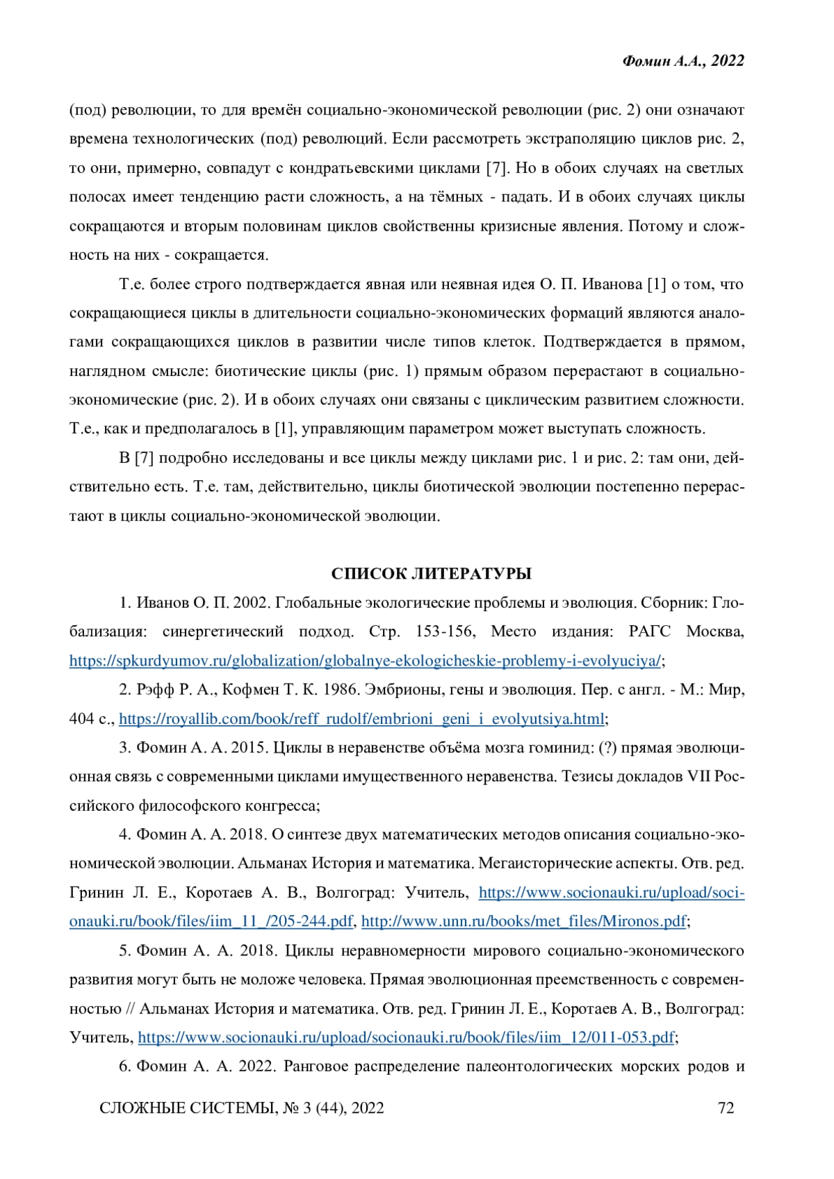 5. Фомин А. А. 2018. Циклы неравномерности мирового социально-экономического развития могут быть не моложе человека. Прямая эволюционная преемственность с современностью //Альманах История и математика. Отв. ред. Гринин Л. Е., Коротаев А. В., Волгоград: Учитель, https://www.socionauki.ru/upload/socionauki.ru/book/files/iim_12/011-053.pdf. EDN: LXMIRN
