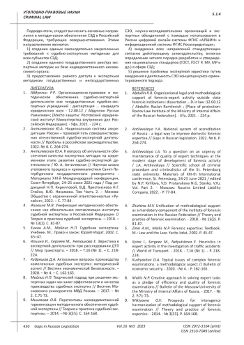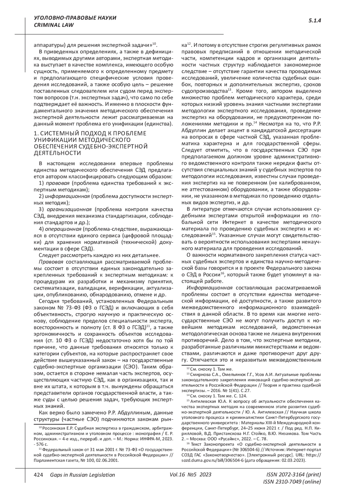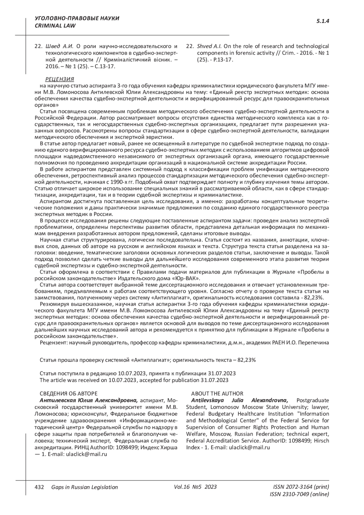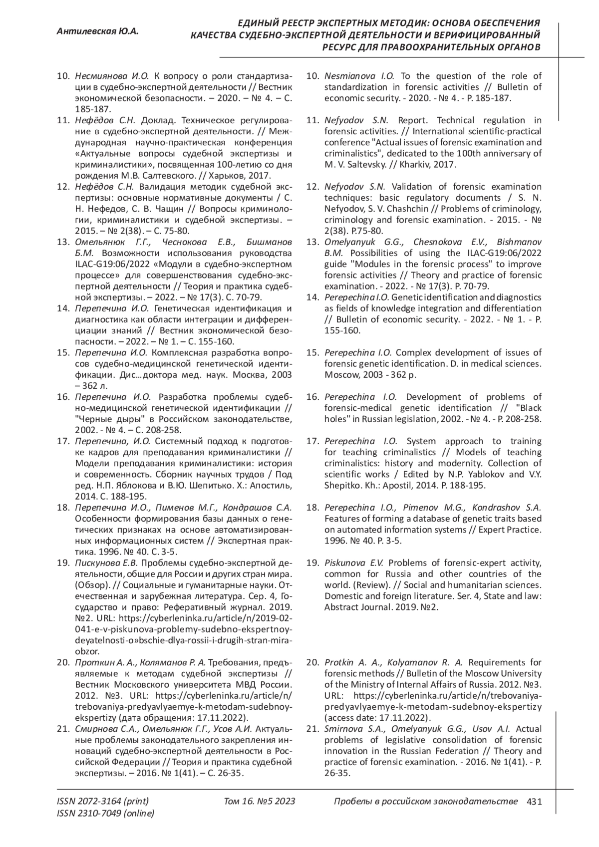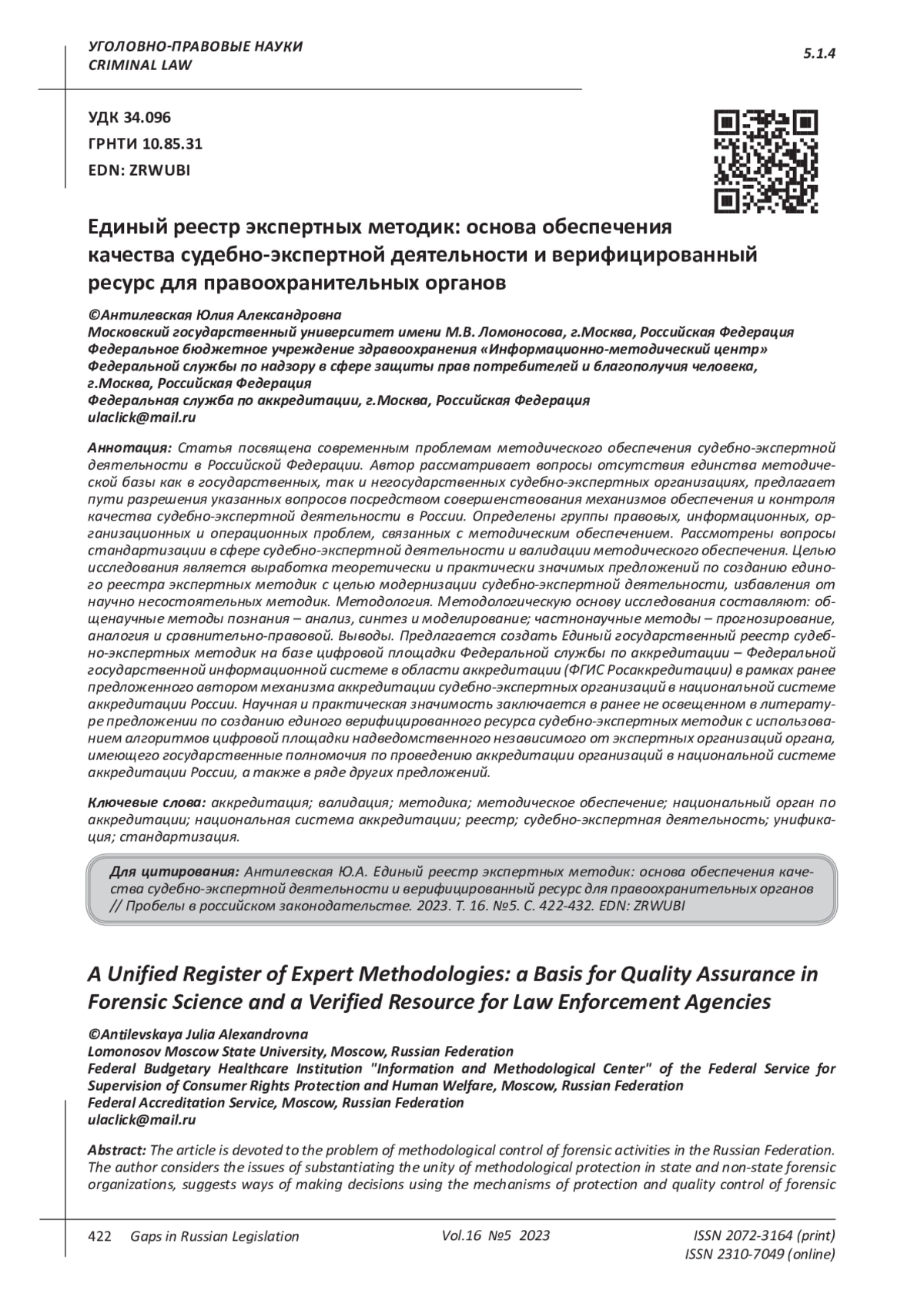 АНТИЛЕВСКАЯ Ю. А. ЕДИНЫЙ РЕЕСТР ЭКСПЕРТНЫХ МЕТОДИК: ОСНОВА ОБЕСПЕЧЕНИЯ КАЧЕСТВА СУДЕБНО-ЭКСПЕРТНОЙ ДЕЯТЕЛЬНОСТИ И ВЕРИФИЦИРОВАННЫЙ РЕСУРС ДЛЯ ПРАВООХРАНИТЕЛЬНЫХ ОРГАНОВ // ПРОБЕЛЫ В РОССИЙСКОМ ЗАКОНОДАТЕЛЬСТВЕ. 2023. Т. 16 № 5