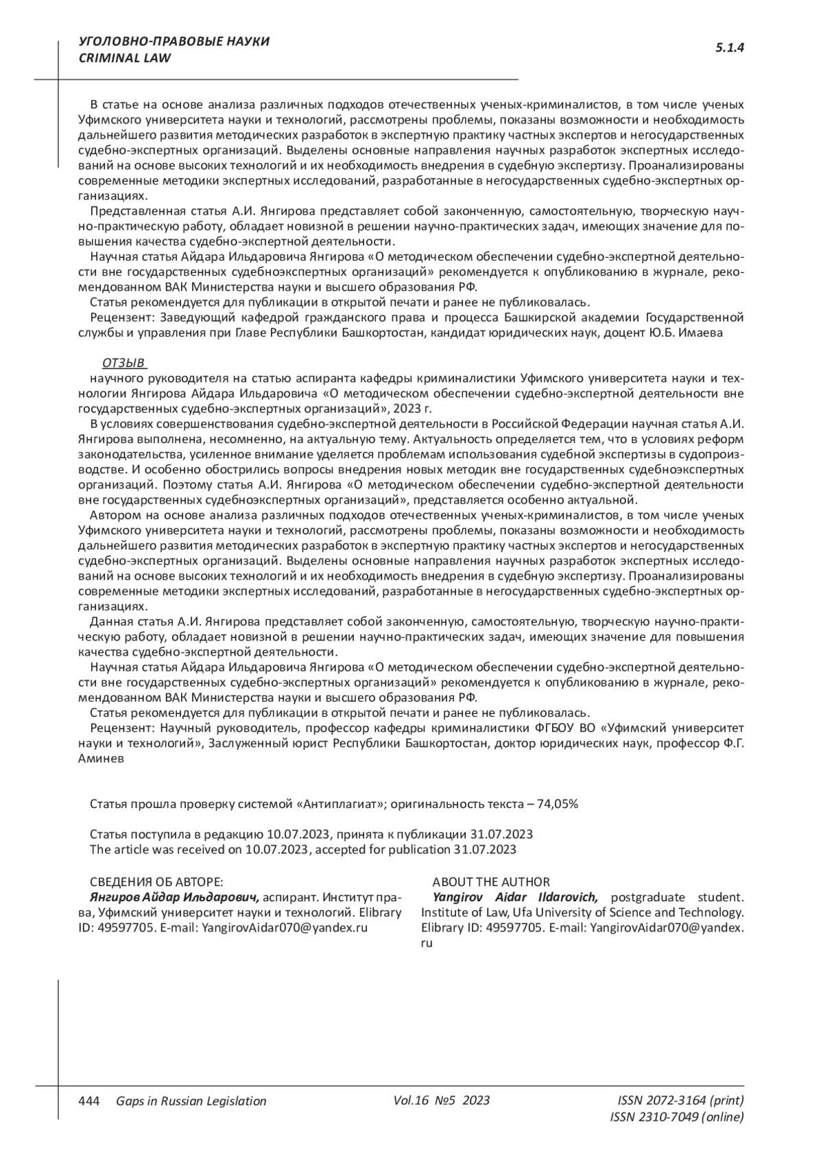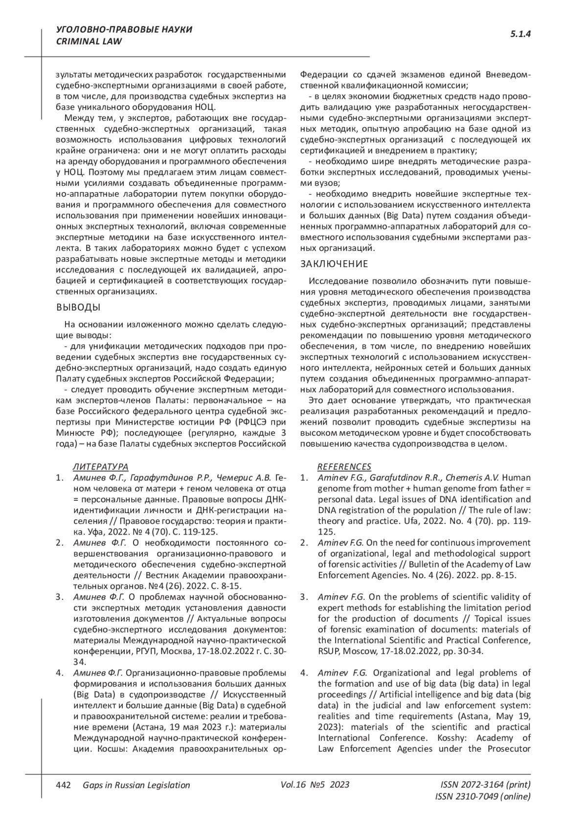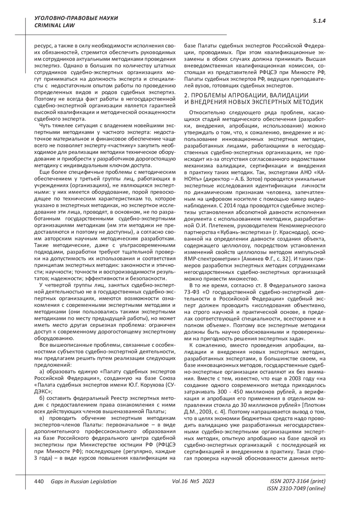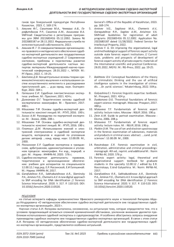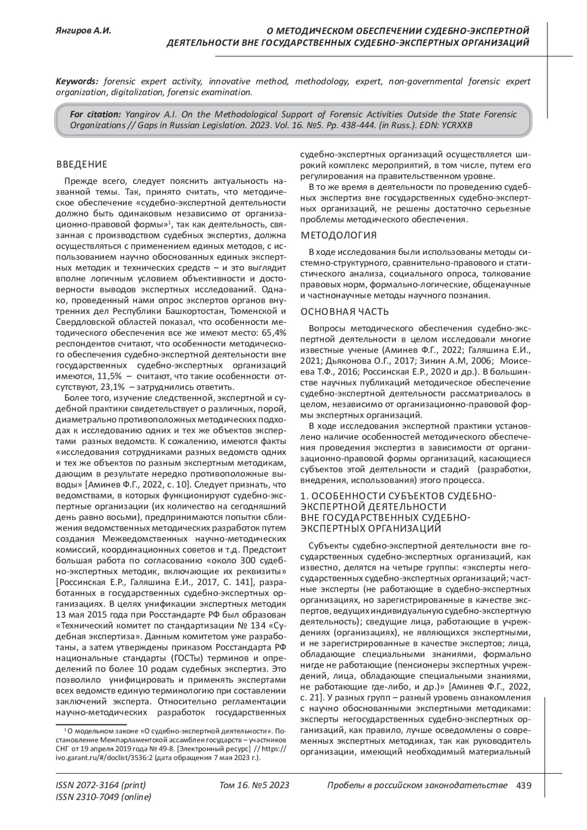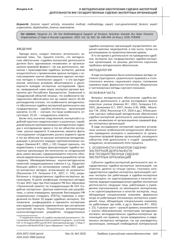 ЯНГИРОВ А. И. О МЕТОДИЧЕСКОМ ОБЕСПЕЧЕНИИ СУДЕБНО-ЭКСПЕРТНОЙ ДЕЯТЕЛЬНОСТИ ВНЕ ГОСУДАРСТВЕННЫХ СУДЕБНО-ЭКСПЕРТНЫХ ОРГАНИЗАЦИЙ // ПРОБЕЛЫ В РОССИЙСКОМ ЗАКОНОДАТЕЛЬСТВЕ. 2023. Т. 16 № 5