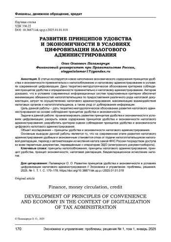 Задачи в данной работе: проанализировать развитие принципов удобства и экономичности в условиях цифровизации; раскрыть новое содержание принципов удобства и экономичности налогового администрирования; разработать критерии оценки соблюдения принципов удобства и экономичности цифрового налогового администрирования.