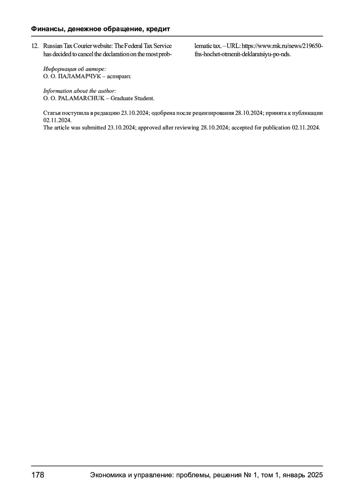 12. Сайт Российский налоговый курьер: ФНС задумала отменить декларацию по самому проблемному налогу. - URL: https://www.rnk.ru/news/219650-fns-hochet-otmenit-deklaratsiyu-po-nds.