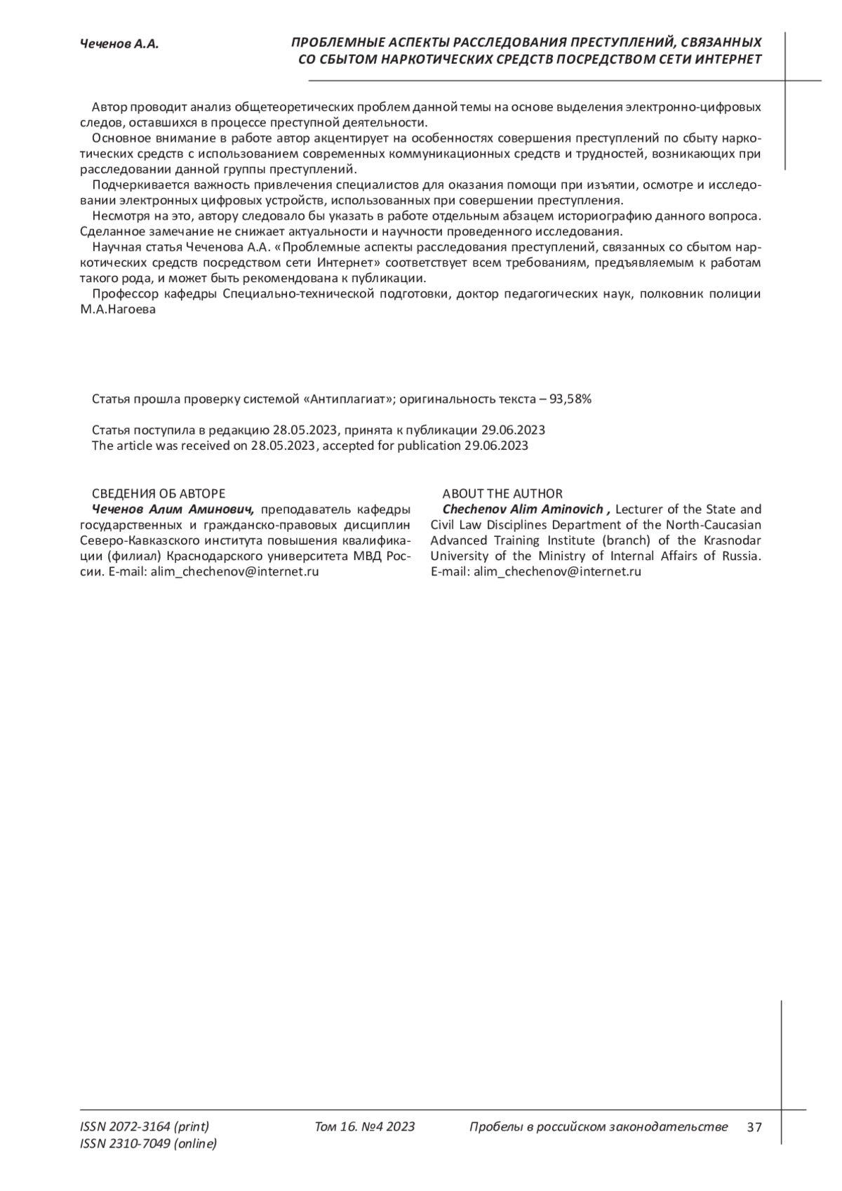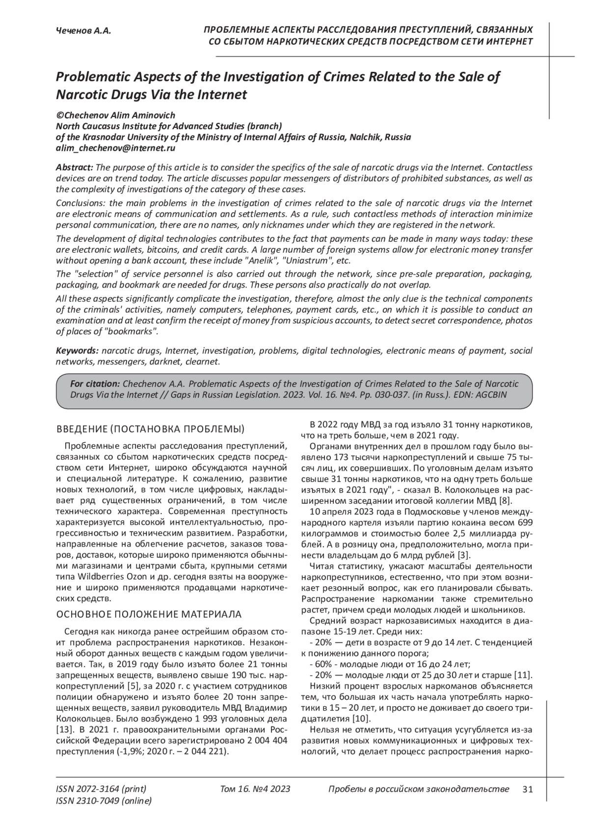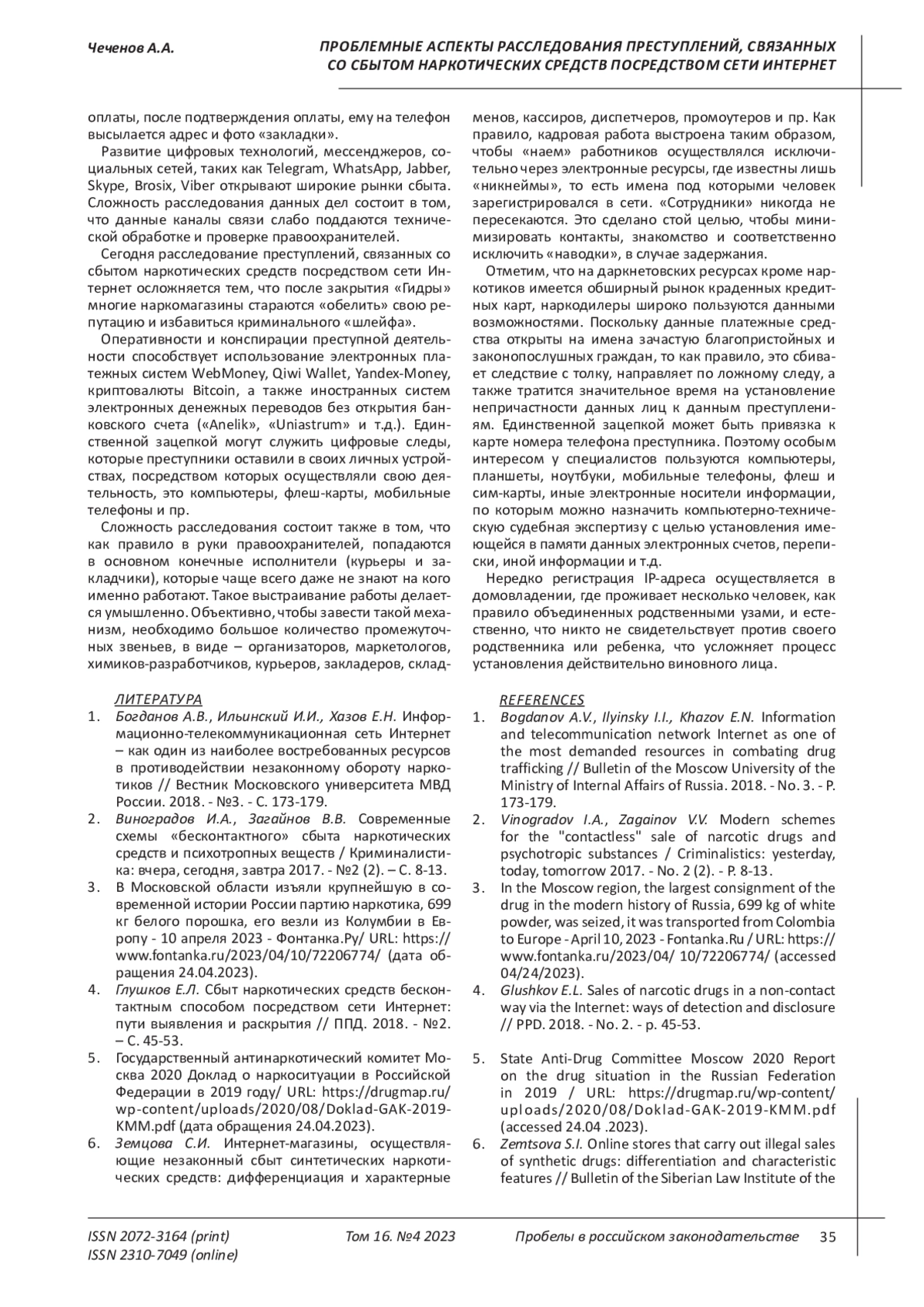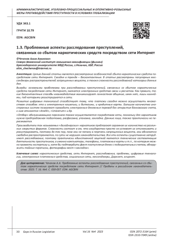 ЧЕЧЕНОВ А. А. ПРОБЛЕМНЫЕ АСПЕКТЫ РАССЛЕДОВАНИЯ ПРЕСТУПЛЕНИЙ, СВЯЗАННЫХ СО СБЫТОМ НАРКОТИЧЕСКИХ СРЕДСТВ ПОСРЕДСТВОМ СЕТИ ИНТЕРНЕТ // ПРОБЕЛЫ В РОССИЙСКОМ ЗАКОНОДАТЕЛЬСТВЕ. 2023. Т. 16 № 4