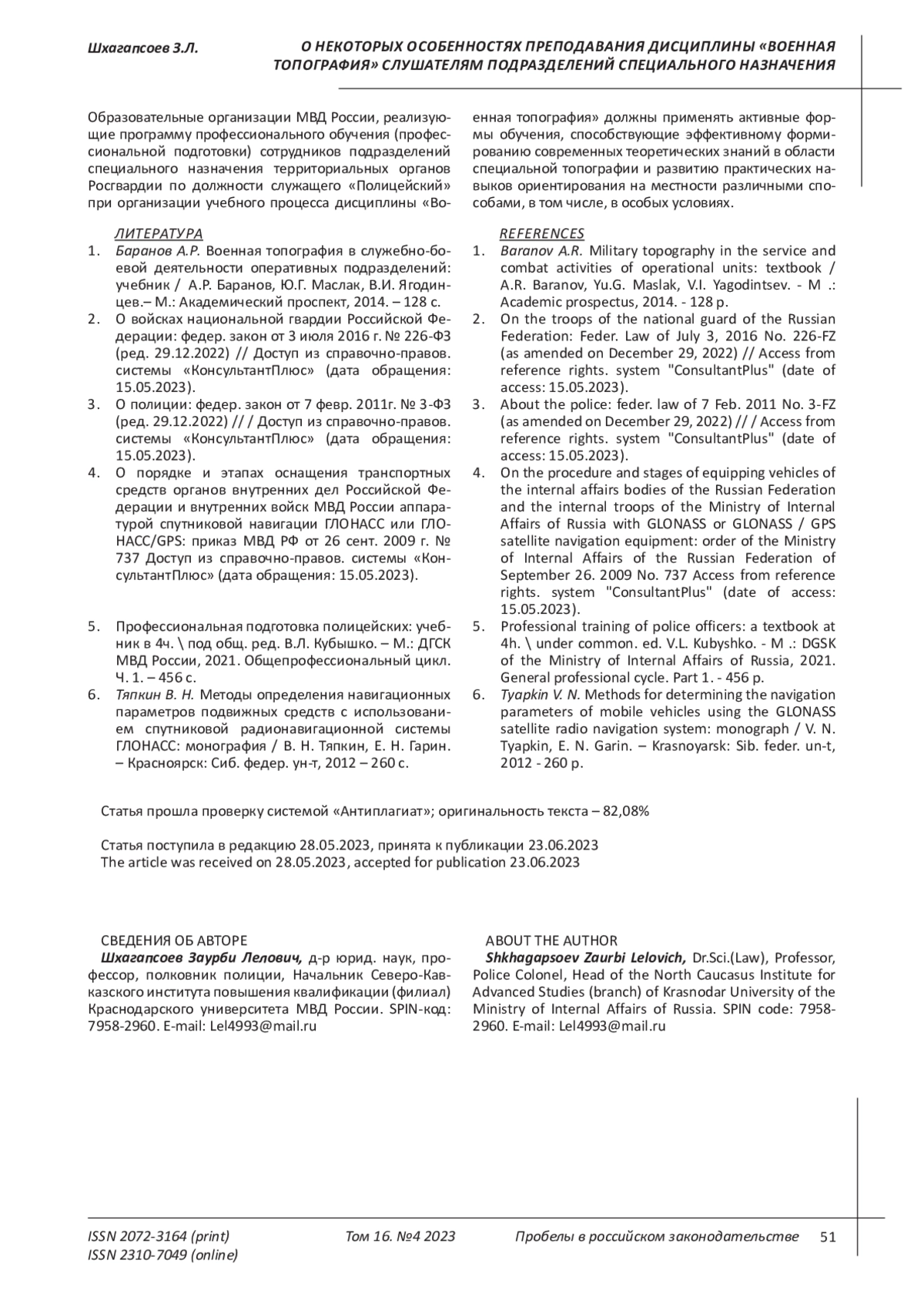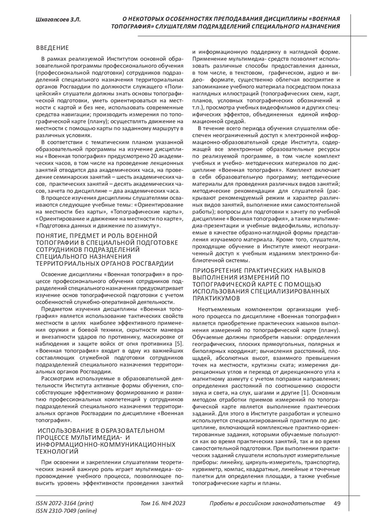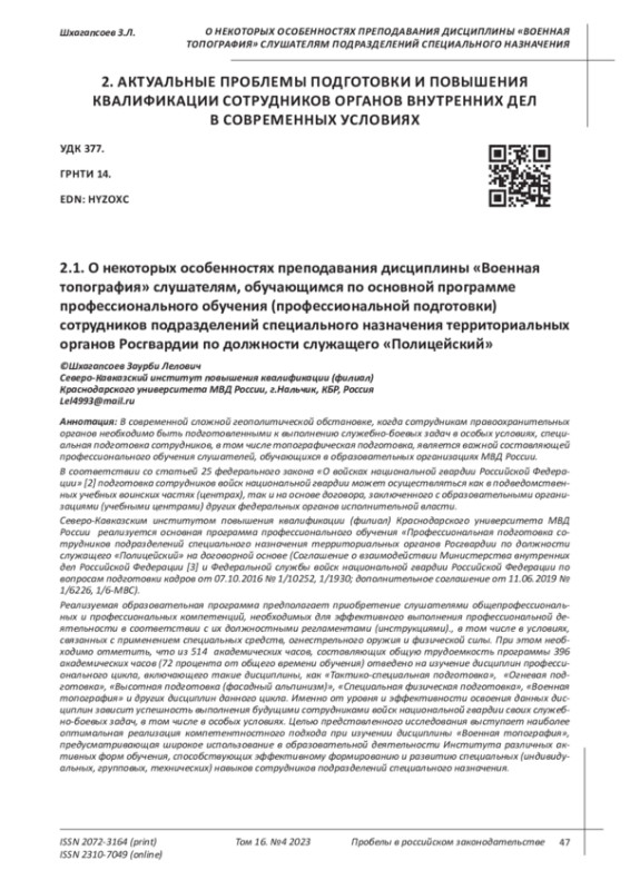 ШХАГАПСОЕВ З. Л. О НЕКОТОРЫХ ОСОБЕННОСТЯХ ПРЕПОДАВАНИЯ ДИСЦИПЛИНЫ "ВОЕННАЯ ТОПОГРАФИЯ" СЛУШАТЕЛЯМ, ОБУЧАЮЩИМСЯ ПО ОСНОВНОЙ ПРОГРАММЕ ПРОФЕССИОНАЛЬНОГО ОБУЧЕНИЯ (ПРОФЕССИОНАЛЬНОЙ ПОДГОТОВКИ) СОТРУДНИКОВ ПОДРАЗДЕЛЕНИЙ СПЕЦИАЛЬНОГО НАЗНАЧЕНИЯ ТЕРРИТОРИАЛЬНЫХ ОРГАНОВ РОСГВАРДИИ ПО ДОЛЖНОСТИ СЛУЖАЩЕГО "ПОЛИЦЕЙСКИЙ" // ПРОБЕЛЫ В РОССИЙСКОМ ЗАКОНОДАТЕЛЬСТВЕ. 2023. Т. 16 № 4