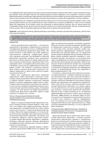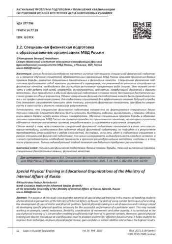 Целью данного исследования является изучение потенциала специальной физической подготовки в процессе обучения слушателей образовательных организаций МВД России навыкам применения боевых приемов борьбы, развития специальных двигательных и физических качеств. Специальная физическая подготовка представляет собой комплекс упражнений и тренировок, направленный на развитие специфических физических качеств, необходимых для успешного выполнения конкретного вида спорта. Это может включать в себя работу над силой, скоростью, выносливостью, гибкостью, координацией движений и другими аспектами. Она проводится в обычной физической подготовке человека после достижения достаточно высокого уровня ее общих вариантов. Однако специальная физическая подготовка может быть проводима также и на профессиональном уровне, для подготовки слушателей для эффективного несения будущей службы. Она помогает слушателям повысить свою технику, улучшить физические показатели, приобрести уверенность в своих силах и достичь наивысших результатов. Установлено, что специальная физическая подготовка направлена на формирование специальных двигательных навыков. Слушатели должны быть сильными, быстрыми, гибкими, выносливыми и ловкими. Однако, очень важен баланс между всеми этими показателями. Обучение специальным приемам борьбы в образовательных организациях МВД России как правило проходят на практических занятиях, на которых слушатели обучаются технике выполнения приемов, отрабатывают их применение в различных ситуациях. Сделан вывод о том, что сложность специальной физической подготовки заключается в том, что классические методики, используемые для поднятия общей физической подготовки, не подходят и в результате преподаватели сталкиваются с рядом сложностей. Во-первых, если речь идет о подготовке слушателя в рамках специальной физической подготовки, то нельзя игнорировать индивидуальность каждого человека, а значит преподавателям необходимо применить в арсенале разнообразнейшие методики, системы и в том числе упражнения. Только индивидуальный подход позволит им добиться требуемых результатов.