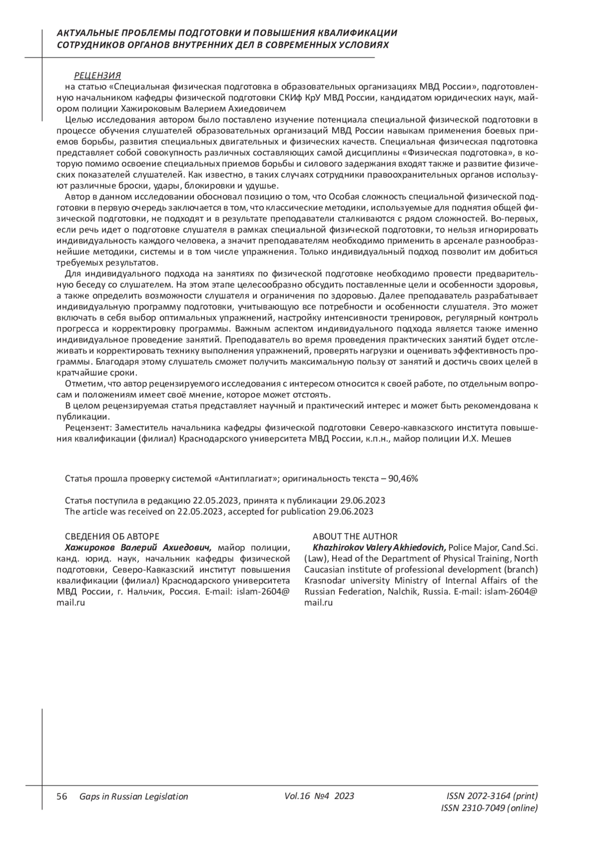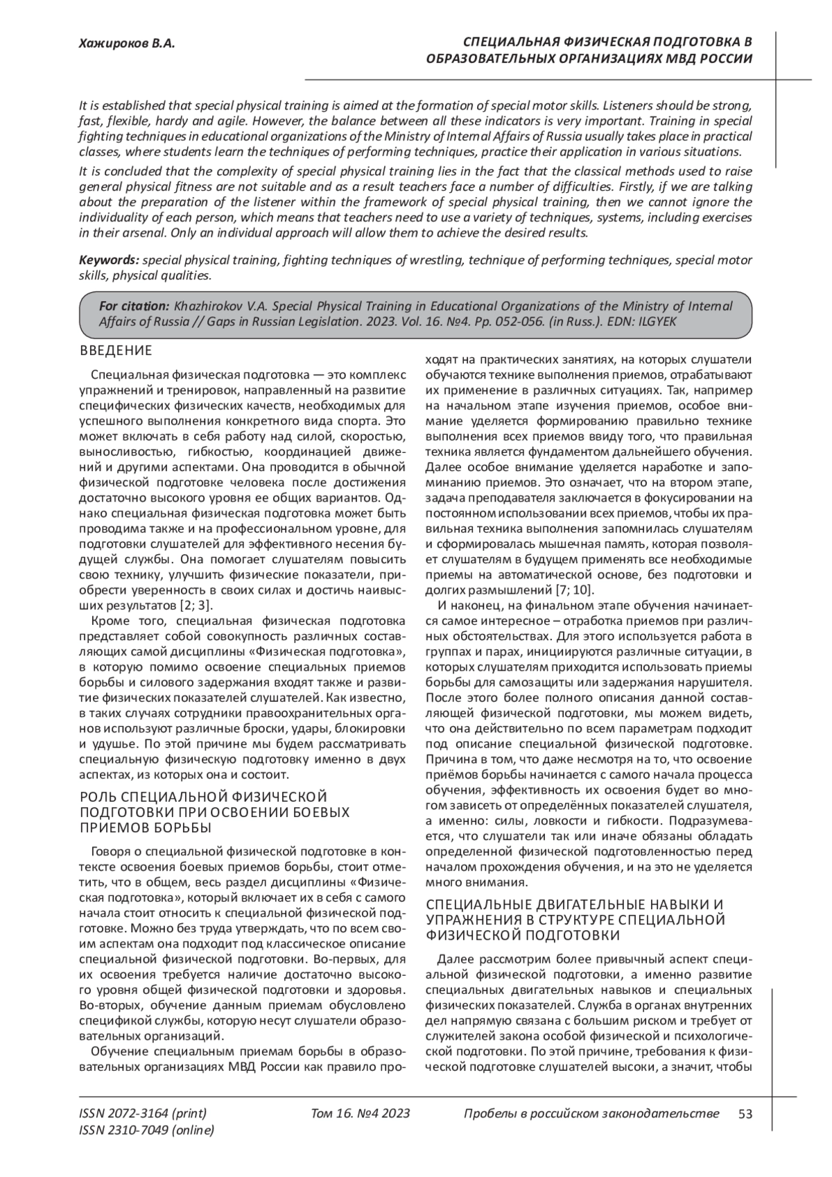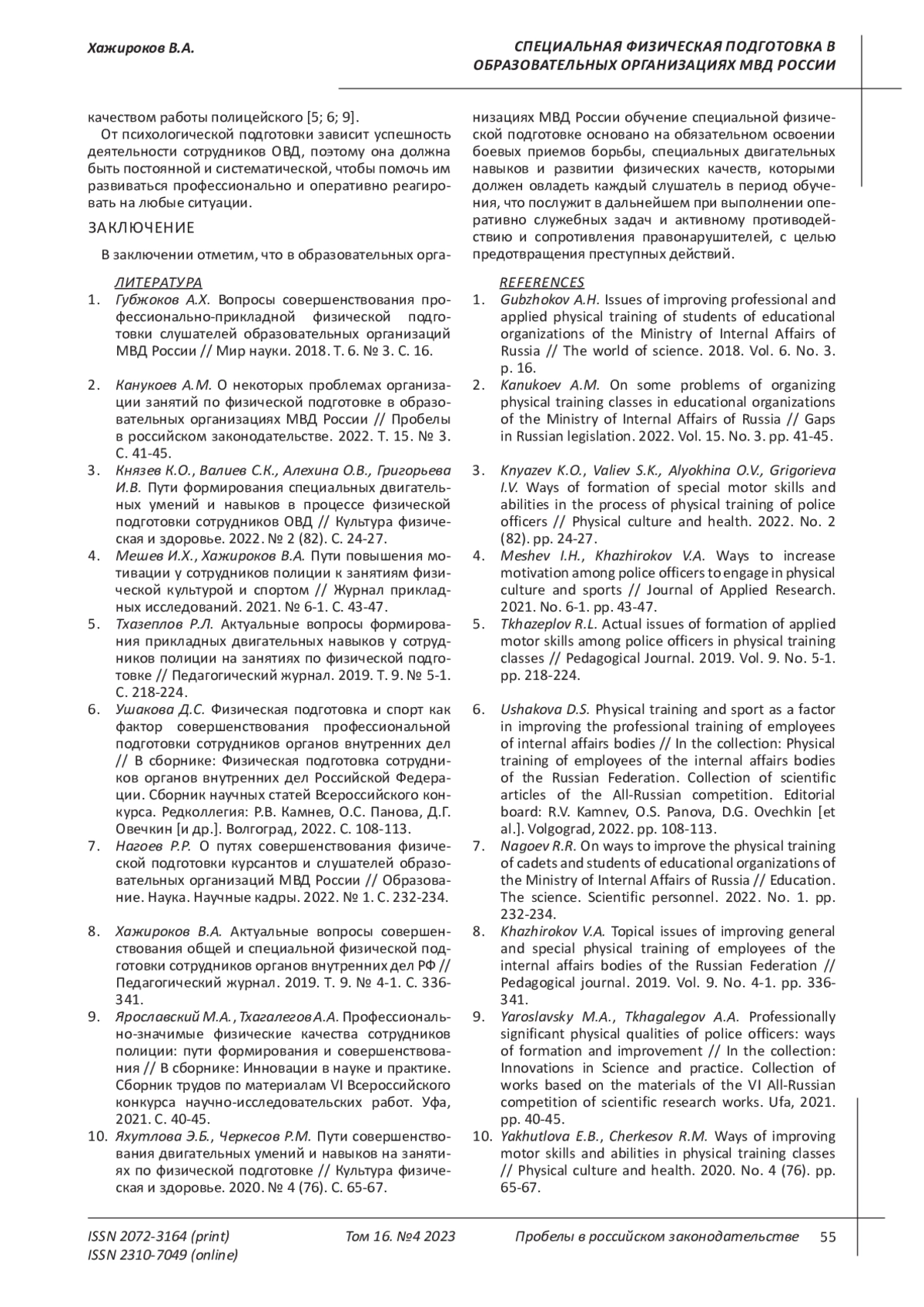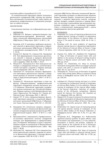 8. Хажироков В.А. Актуальные вопросы совершенствования общей и специальной физической подготовки сотрудников органов внутренних дел РФ // Педагогический журнал. 2019. Т. 9. № 4-1. С. 336-341. EDN: CQTUAV