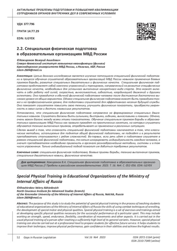 Kanukoev A.M. On some problems of organizing physical training classes in educational organizations of the Ministry of Internal Affairs of Russia // Gaps in Russian legislation. 2022. Vol. 15. No. 3. pp. 41-45. EDN: ZRXJLL