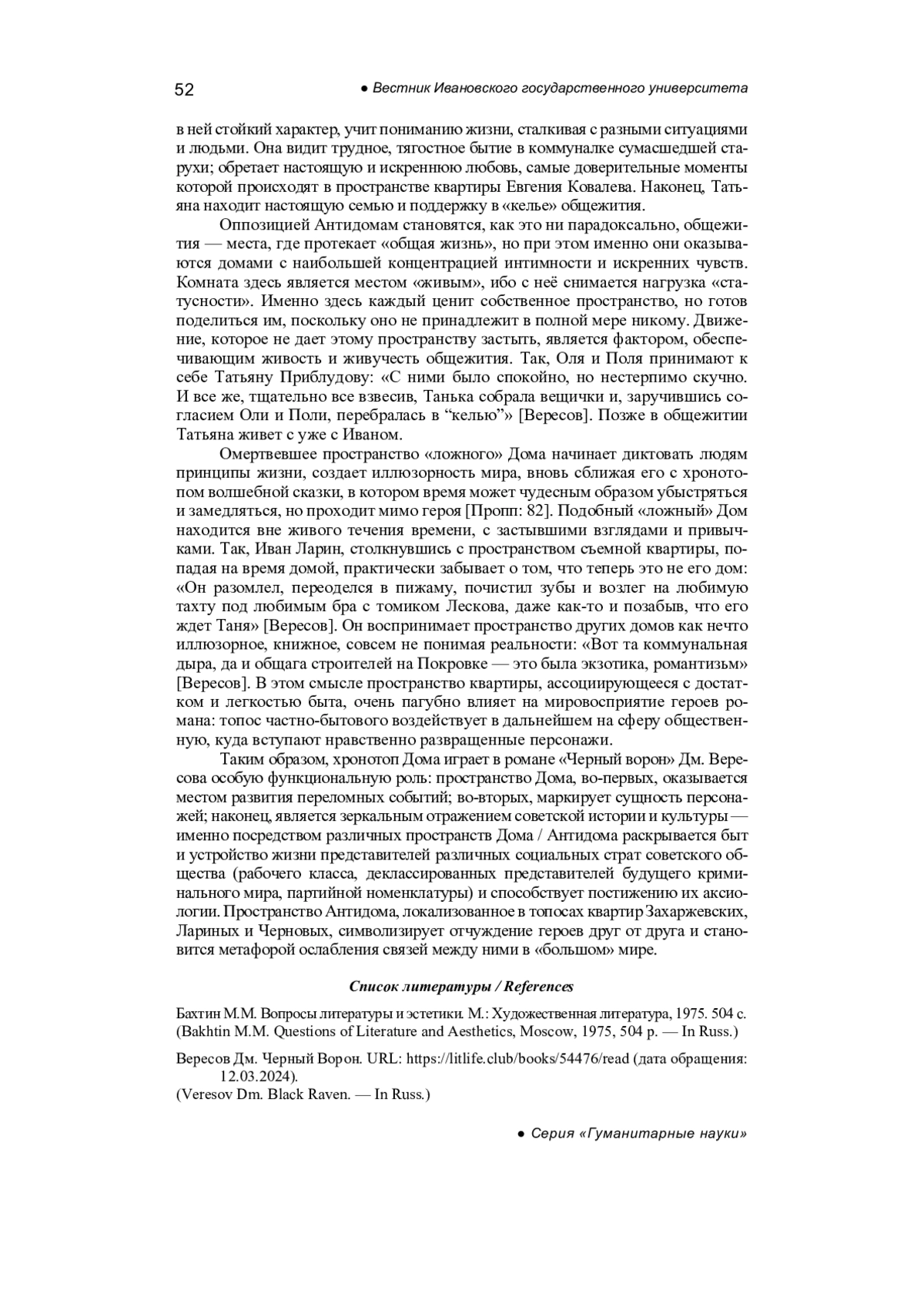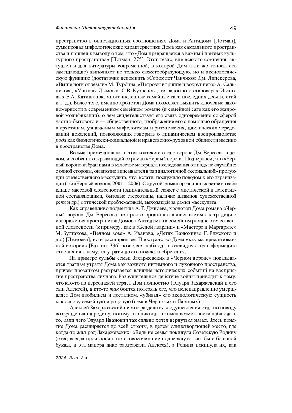ОСЬМУХИНА О. Ю., ШИШОНКОВА М. С. ХРОНОТОП ДОМА В РОМАНЕ Д. ВЕРЕСОВА "ЧЕРНЫЙ ВОРОН" // ВЕСТНИК ИВАНОВСКОГО ГОСУДАРСТВЕННОГО УНИВЕРСИТЕТА. СЕРИЯ: ГУМАНИТАРНЫЕ НАУКИ. 2024. № 3