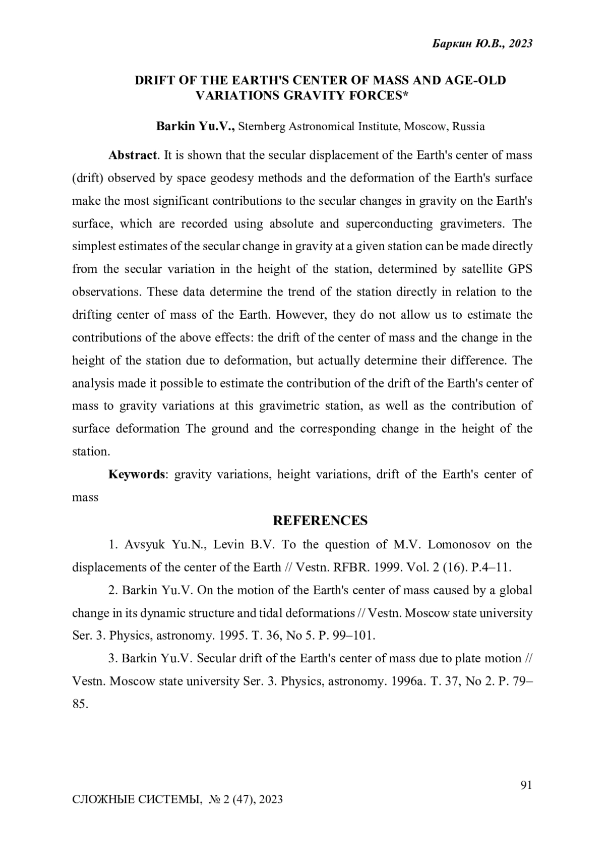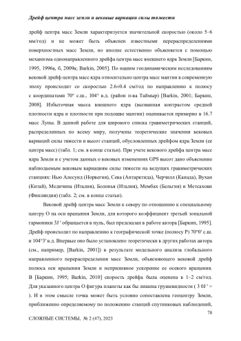 Показано, что вековое смещение центра масс Земли (дрейф), наблюдаемое методами космической геодезии, и деформация поверхности Земли дают наиболее значительные вклады в вековые изменения силы тяжести на поверхности Земли, которые фиксируются с помощью абсолютных и сверхпроводящих гравиметров. Простейшие оценки векового изменения силы тяжести на данной станции могут быть сделаны непосредственно по вековой вариации высоты станции, определенной по спутниковым данным GPS наблюдений. Эти данные определяют тренд станции непосредственно по отношению к дрейфующему центру масс Земли. Однако, они не позволяют оценить вклады указанных выше эффектов: дрейфа центра масс и изменения высоты станции из-за деформации, а фактически определяют их разность. Выполненный анализ позволил оценить вклад дрейфа центра масс Земли в вариации силы тяжести на данной гравиметрической станции, а также вклад деформации поверхности Земли и соответствующего изменения высоты станции. Для 8 известных и ведущих гравиметрических станций указанные составляющие вариаций силы тяжести были вычислены. Было показано, что указанные два фактора являются основными, а их сумма в основном объясняет наблюдаемые в настоящее время вариации силы тяжести на ряде известных гравиметрических станций: Нью Алесунд (Норвегия), Сева (Антарктида), Черчилл (Канада), Вухан (Китай), Медичина (Италия), Болонья (Италия), Мембах (Бельгия) и Метсахови (Финляндия).