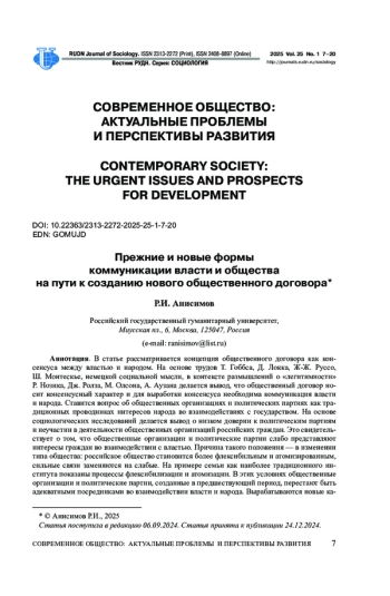 В статье рассматривается концепция общественного договора как консенсуса между властью и народом. На основе трудов Т. Гоббса, Д. Локка, Ж-Ж. Руссо, Ш. Монтескье, немецкой социальной мысли, в контексте размышлений о «легитимности» Р. Нозика, Дж. Ролза, М. Олсона, А. Аузана делается вывод, что общественный договор носит консенсусный характер и для выработки консенсуса необходима коммуникация власти и народа. Cтавится вопрос об общественных организациях и политических партиях как традиционных проводниках интересов народа во взаимодействиях с государством. На основе социологических исследований делается вывод о низком доверии к политическим партиям и неучастии в деятельности общественных организаций российских граждан. Это свидетельствует о том, что общественные организации и политические партии слабо представляют интересы граждан во взаимодействии с властью. Причина такого положения - в изменении типа общества: российское общество становится более флексибильным и атомизированным, сильные связи заменяются на слабые. На примере семьи как наиболее традиционного института показаны процессы флексибилизации и атомизации. В этих условиях общественные организации и политические партии, созданные в предшествующий период, перестают быть адекватными посредниками во взаимодействии власти и народа. Вырабатываются новые каналы коммуникации: интернет-сообщества и прямые обращения граждан к органам власти, минуя посредников в виде общественных организаций и политических партий. Российское общество активно взаимодействует с властью в этих формах, но слабо - в классических, что опровергает представление о народе как пассивном субъекте, распространении политического абсентеизма и неразвитости гражданского общества. Скорее это свидетельствует об утрате актуальности идеи об общественных организациях как выразителе общественных интересов и о необходимости выработки концепций, соответствующих новому типу общества.