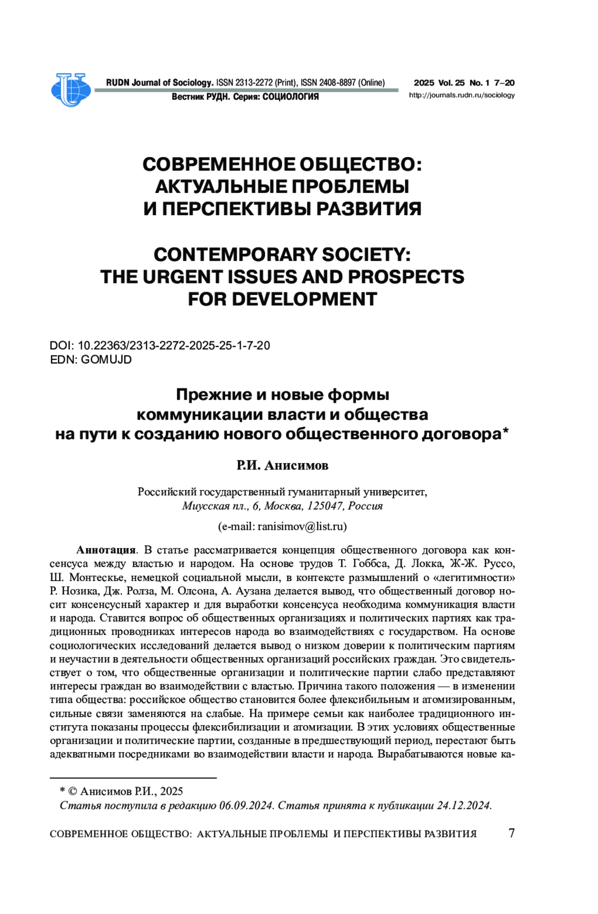 Статья представляет собой рецензию на книгу Ж. Т. Тощенко «Судьбы общественного договора в России: эволюция идей и уроки реализации» (М.: ФНИСЦ РАН; РГГУ, 2025. 844 с.). В монографии описано возникновение и проанализировано содержание концепции общественного договора, впервые выдвинутой и обоснованной мыслителями эпохи Просвещения как идеи социального контракта между народом и государством, причем латентного характера. Значительное внимание в книге уделено сложившимся теориям общественного договора и их особенностям, многообразным вариантам его толкования и осуществления в современной социальной практике. Особый акцент автор делает на выявлении основных характеристик общественного договора, его смысловой сущности как единства целей участников, ориентированных на взаимное доверие, баланс интересов и постоянное использование обратной связи. Представлены современные интерпретации общественного договора и новые варианты осмысления практик его реализации в современной общественно-политической жизни. Проведен обстоятельный анализ исторического опыта реализации общественного договора на разных этапах существования России/СССР в противоречивом развитии и функционировании страны, а также форм участия основных социальных групп в общественном договоре. Обозначены суть, содержание и эволюция идей общественного договора в XX-XXI веках, их трансформация и уроки реализации общественного договора на различных этапах общественного развития.