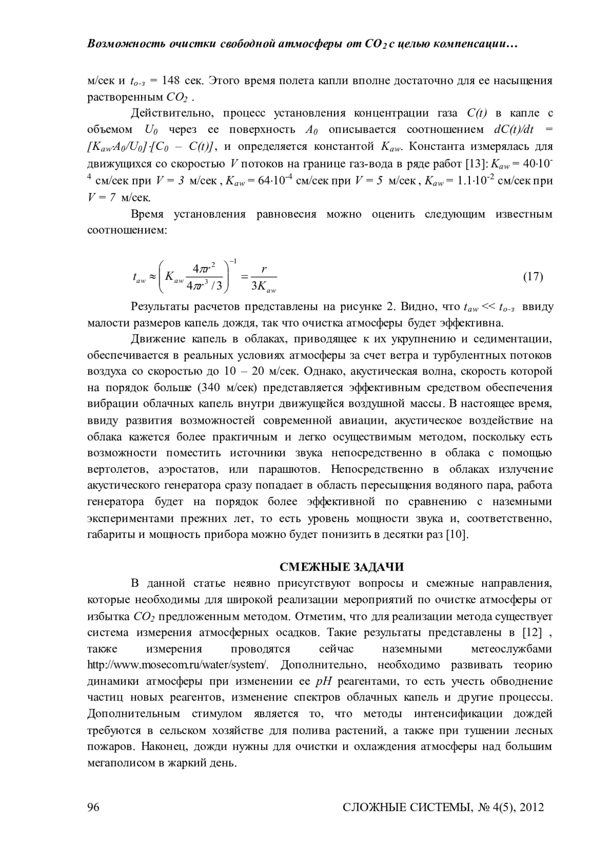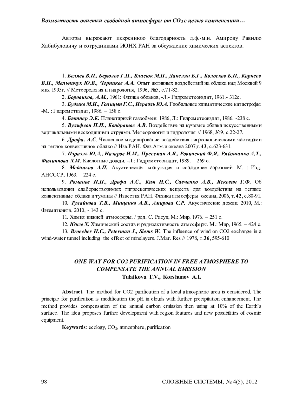 Предложен метод очистки отдельных участков свободной атмосферы от избытка СО 2, искусственно повышая до необходимого уровень pH в облаках с последующей интенсификацией осадков из естественных облаков с целью осаждать из атмосферы расчетное количество углерода. Предложенный метод, при применении на 10% поверхности Земли, способен компенсировать ежегодный промышленный выброс СО2. Метод требует детализации и развития, для проведения активных воздействий на облака, необходим их космический мониторинг с указанием параметров