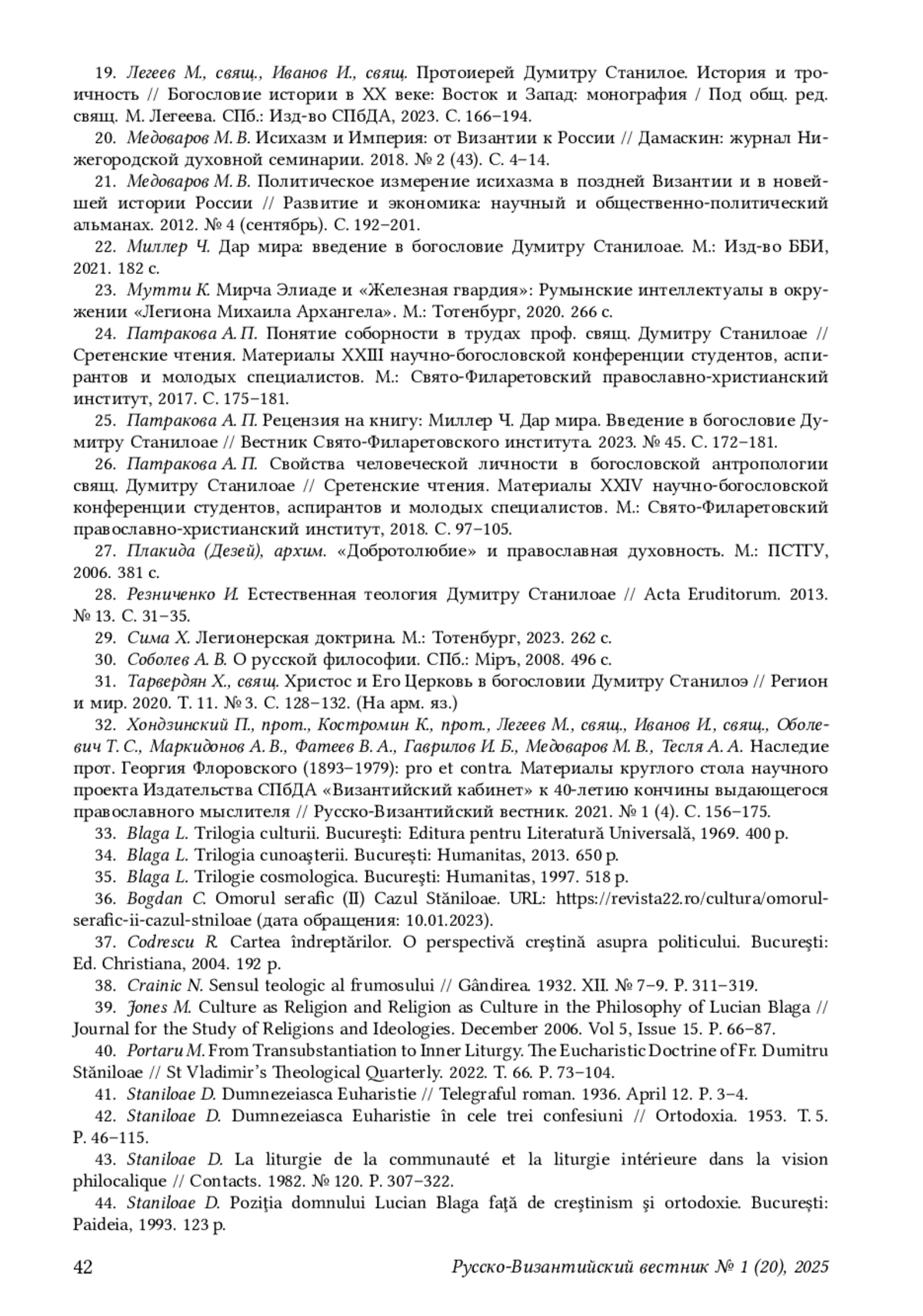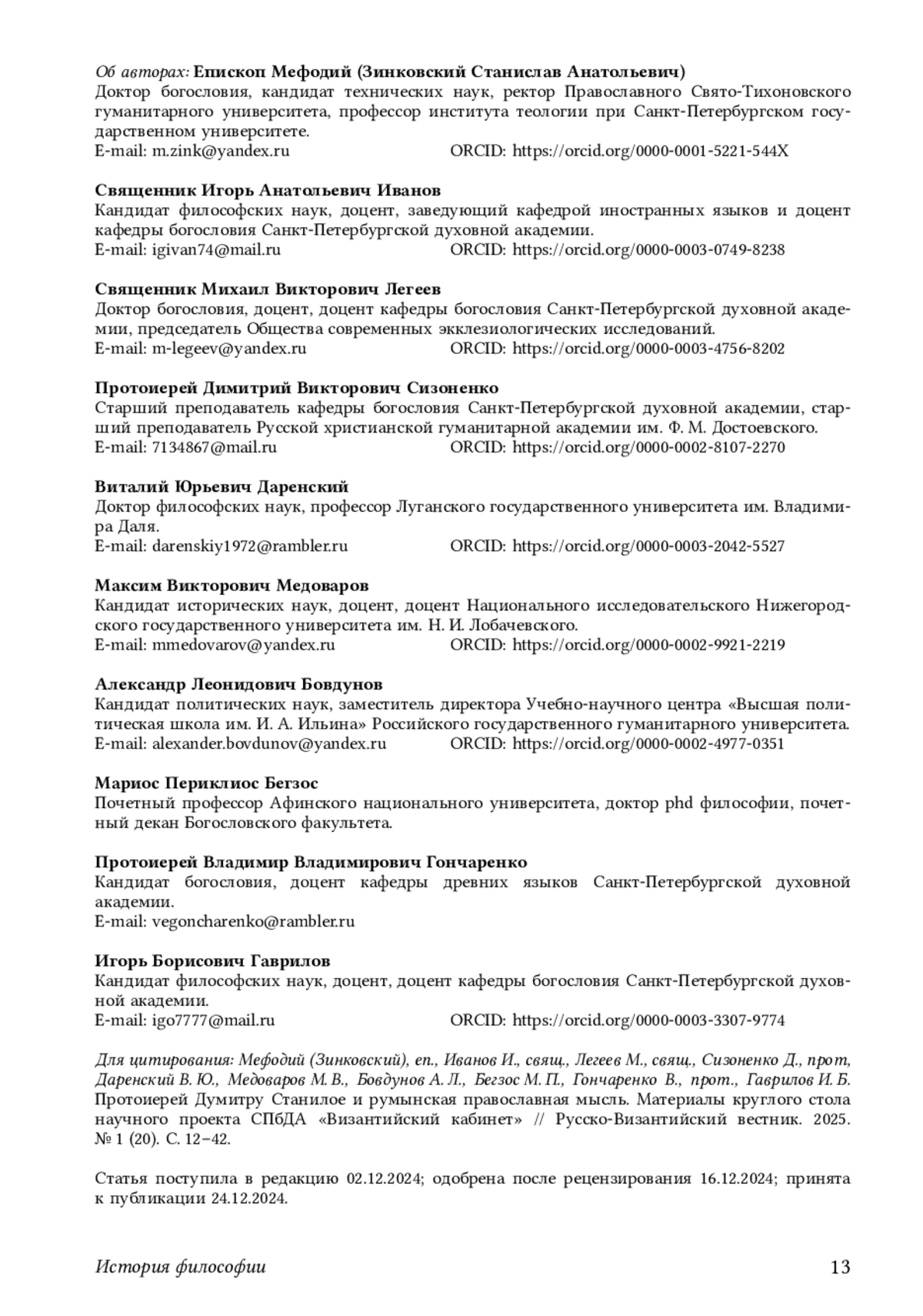 ЗИНКОВСКИЙ С. А., ИВАНОВ И. А., ЛЕГЕЕВ М. В., СИЗОНЕНКО Д. В., ДАРЕНСКИЙ В. Ю., МЕДОВАРОВ М. В., БОВДУНОВ А. Л., БЕГЗОС М. П., ГОНЧАРЕНКО В. В., ГАВРИЛОВ И. Б. ПРОТОИЕРЕЙ ДУМИТРУ СТАНИЛОЕ И РУМЫНСКАЯ ПРАВОСЛАВНАЯ МЫСЛЬ. МАТЕРИАЛЫ КРУГЛОГО СТОЛА НАУЧНОГО ПРОЕКТА СПБДА «ВИЗАНТИЙСКИЙ КАБИНЕТ» // РУССКО-ВИЗАНТИЙСКИЙ ВЕСТНИК. 2025. № 1 (20)