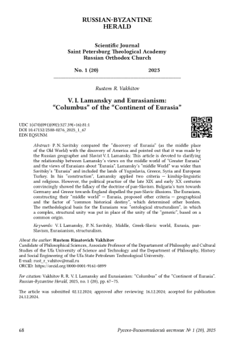 ВАХИТОВ Р. Р. В. И. ЛАМАНСКИЙ И ЕВРАЗИЙСТВО: «КОЛУМБ» «КОНТИНЕНТА ЕВРАЗИЯ» // РУССКО-ВИЗАНТИЙСКИЙ ВЕСТНИК. 2025. № 1 (20)