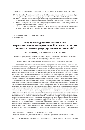 Развитие вспомогательных репродуктивных технологий, особенно суррогатного материнства, требует переосмысления материнства как феномена и понимания логики встраивания гестанционного материнства в структуры родства, поскольку материнство вышло за рамки диады «мать-ребенок» и расширилось до системы «суррогатная мать-ребенок-биологическая мать», что пошатнуло традиционные основы и смыслы, казалось бы, устойчивой и незыблемой конструкции родительства. Новые реалии формируют новые трактовки и новые роли материнства, ставя перед исследователями задачу описания тех, кто сегодня принимает решение стать суррогатной матерью, а именно - ее социального портрета и социального статуса. Социальный портрет помогает понять, кто становится суррогатной матерью и почему, - авторы перечисляют ряд демографических характеристик (возраст, место жительства, семейное положение, уровень образования и т. д.) и личностных черт, которые позволяют женщине выполнять эту сложную роль. Также авторы пытаются реконструировать общественное восприятие суррогатного материнства и то, как вовлеченные стороны (суррогатные матери, биологические родители, специалисты по репродукции) определяют позицию суррогатной матери в структуре родства. Проведенное авторами эмпирическое исследование позволило описать среднестатистическую суррогатную мать и ее статус в системе семейных отношений на основе сочетания методов экспертного интервью (с репродуктологами, репродуктивными психологами и агентами по рекрутингу, N=6) и репрезентативного опроса (N=1300). Согласно полученным данным, суррогатная мать в России - это, как правило, женщина 25-33 лет, имеющая 1-2 здоровых детей, часто одинокая мама или состоящая в повторном браке, со средним профессиональным образованием и невысоким доходом, проживающая в регионе. С психологической точки зрения эксперты отмечают ее «легкий взгляд на жизнь», простоту, ответственность и адекватное понимание ситуации. В общественном мнении суррогатная мать не включена в структуру родства, а выполняет временную функцию, после чего ее договорные обязательства считаются завершенными, т. е. суррогатная мать выполняет роль помощника в решении проблемы бесплодия (оказывает услуги по вынашиванию и рождению генетического ребенка пары), факт обращения к которому часто анонимизируется обеими сторонами для создания «нормального» образа семьи и снижения социального давления на суррогатную мать.