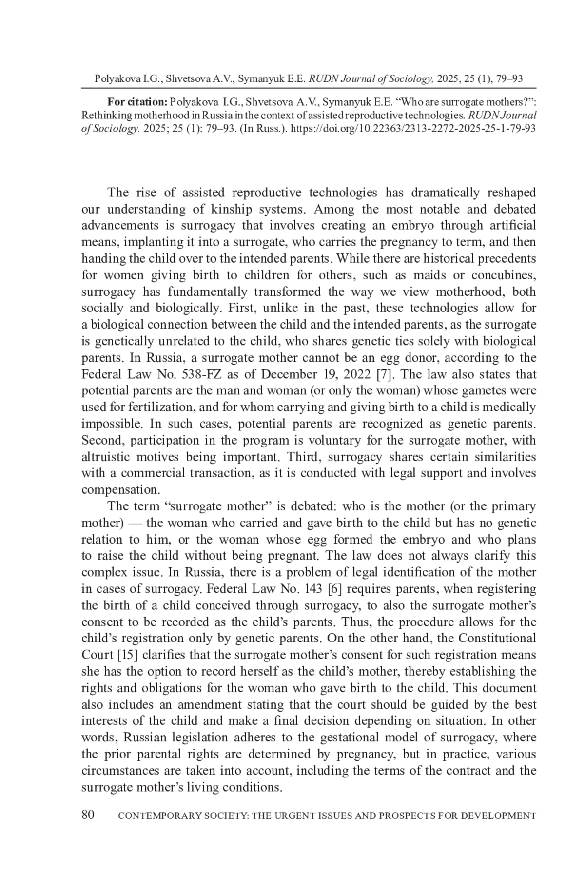 The rise of assisted reproductive technologies has dramatically reshaped our understanding of kinship systems. Among the most notable and debated advancements is surrogacy that involves creating an embryo through artificial means, implanting it into a surrogate, who carries the pregnancy to term, and then handing the child over to the intended parents. While there are historical precedents for women giving birth to children for others, such as maids or concubines, surrogacy has fundamentally transformed the way we view motherhood, both socially and biologically. First, unlike in the past, these technologies allow for a biological connection between the child and the intended parents, as the surrogate is genetically unrelated to the child, who shares genetic ties solely with biological parents. In Russia, a surrogate mother cannot be an egg donor, according to the Federal Law No. 538-FZ as of December 19, 2022 [7].
