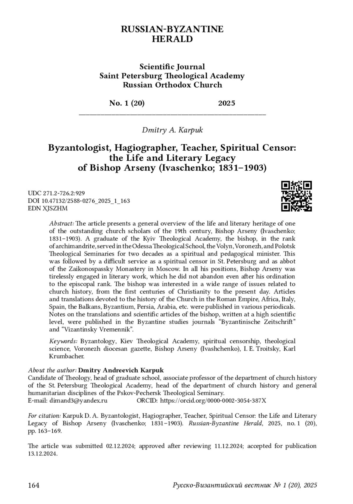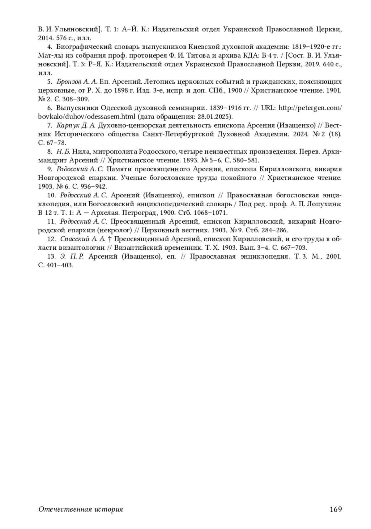7. Карпук Д. А. Духовно-цензорская деятельность епископа Арсения (Иващенко) // Вестник Исторического общества Санкт-Петербургской Духовной Академии. 2024. № 2 (18). С. 67-78. EDN: BUQIVS