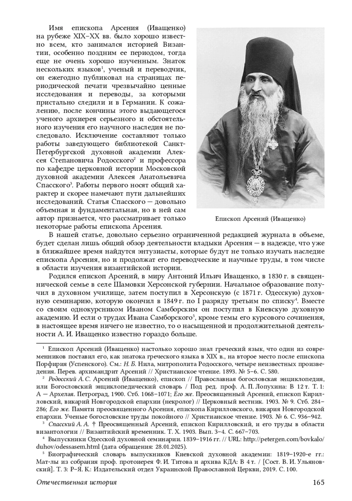 Имя епископа Арсения (Иващенко) на рубеже XIX–XX вв. было хорошо известно всем, кто занимался историей Византии, особенно поздним ее периодом, тогда еще не очень хорошо изученным. Знаток нескольких языков1, ученый и переводчик, он ежегодно публиковал на страницах периодической печати чрезвычайно ценные исследования и переводы, за которыми пристально следили и в Германии. К сожалению, после кончины этого выдающегося ученого архиерея серьезного и обстоятельного изучения его научного наследия не последовало. Исключение составляют только работы заведующего библиотекой Санкт-Петербургской духовной академии Алексея Степановича Родосского2 и профессора по кафедре церковной истории Московской духовной академии Алексея Анатольевича Спасского3. Работы первого носят общий характер и скорее намечают пути дальнейших исследований. Статья Спасского — довольно объемная и фундаментальная, но в ней сам автор признается, что рассматривает только некоторые работы епископа Арсения.