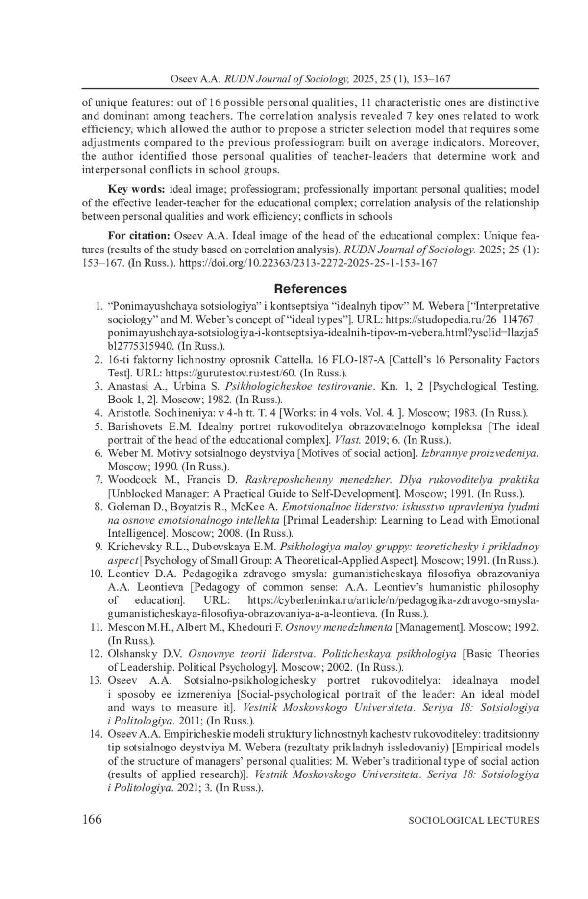 14. Осеев А.А. Эмпирические модели структуры личностных качеств руководителей: традиционный тип социального действия М. Вебера (результаты прикладных исследований) // Вестник Московского университета. Серия 18: Социология и политология. 2021. № 3. EDN: MJQOEG