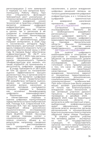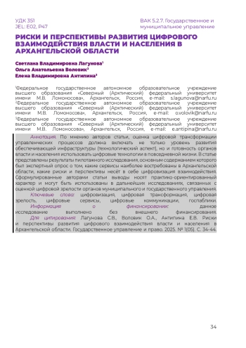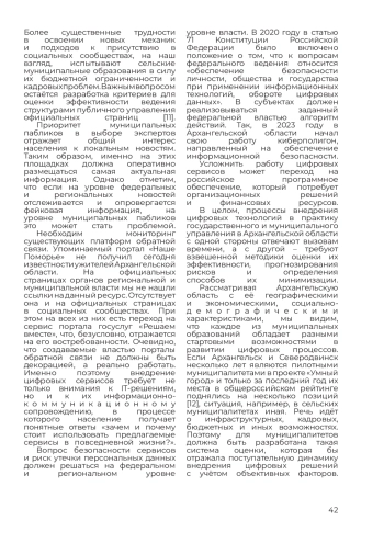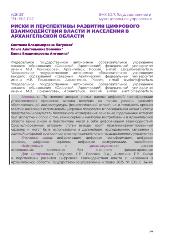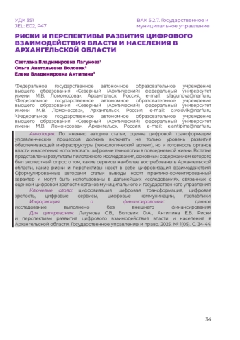 По мнению авторов статьи, оценка цифровой трансформации управленческих процессов должна включать не только уровень развития обеспечивающей инфраструктуры (технологический аспект), но и готовность органов власти и населения использовать цифровые технологии в повседневной жизни. В статье представлены результаты пилотажного исследования, основным содержанием которого был экспертный опрос о том, какие сервисы наиболее востребованы в Архангельской области, какие риски и перспективы несёт в себе цифровизация взаимодействия. Сформулированные авторами статьи выводы носят практико-ориентированный характер и могут быть использованы в дальнейших исследованиях, связанных с оценкой цифровой зрелости органов муниципального и государственного управления.