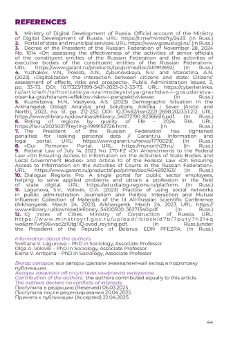 4. Южаков В.Н., Покида А.Н., Зыбуновская Н.В., Старостина А.Н. Цифровизация взаимодействия граждан и государства: оценка гражданами эффектов, рисков и перспектив // Вопросы государственного и муниципального управления. 2023. № 2. С. 33-71. URL: https://cyberleninka.ru/article/n/tsifrovizatsiya-vzaimodeystviya-grazhdan-i-gosudarstva-otsenka-grazhdanami-effektov-riskov-i-perspektiv/viewer. DOI: 10.17323/1999-5431-2023-0-2-33-73