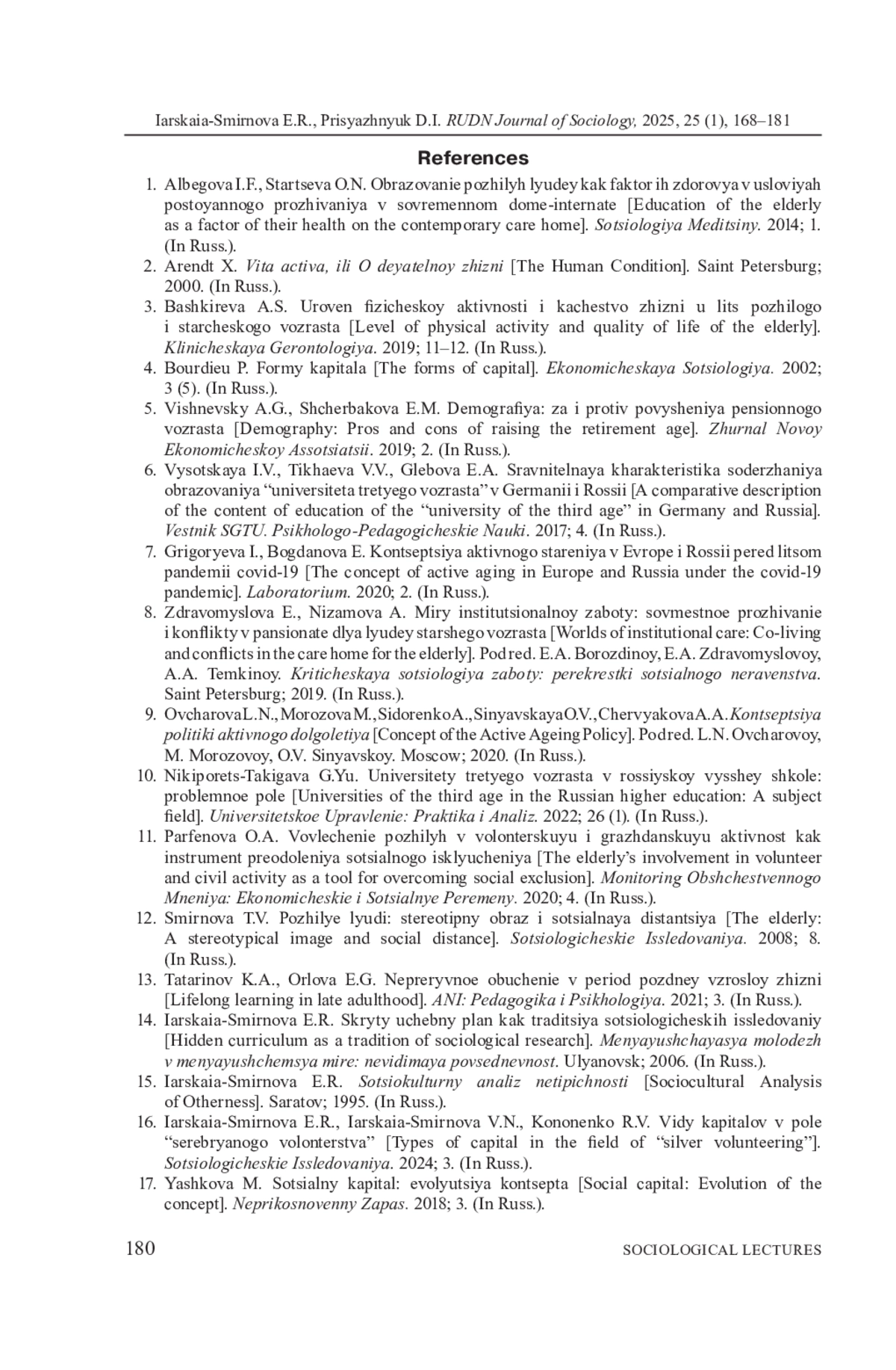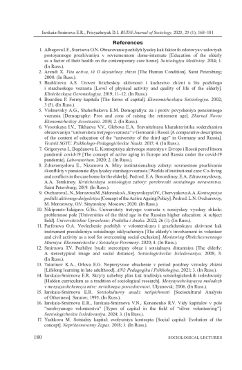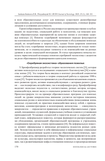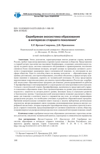 ЯРСКАЯ-СМИРНОВА Е. Р., ПРИСЯЖНЮК Д. И. СЕРЕБРЯНАЯ ЭКОСИСТЕМА ОБРАЗОВАНИЯ В ИНТЕРЕСАХ СТАРШЕГО ПОКОЛЕНИЯ // ВЕСТНИК РОССИЙСКОГО УНИВЕРСИТЕТА ДРУЖБЫ НАРОДОВ. СЕРИЯ: СОЦИОЛОГИЯ. 2025. Т. 25 № 1